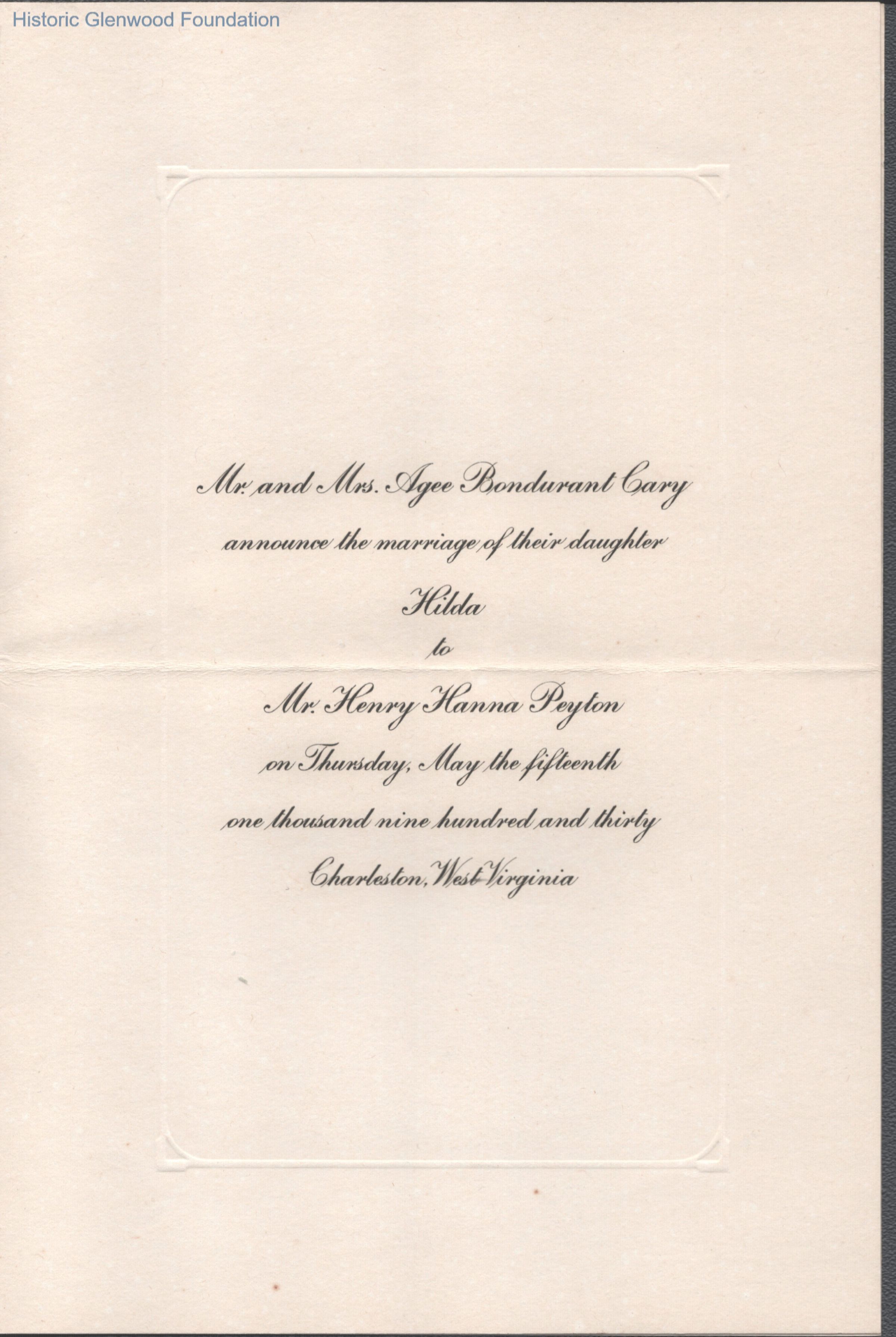 Invitation to Hilda Cary and Henry H. Peyton wedding, May 15, 1930.Date(s) of Creation