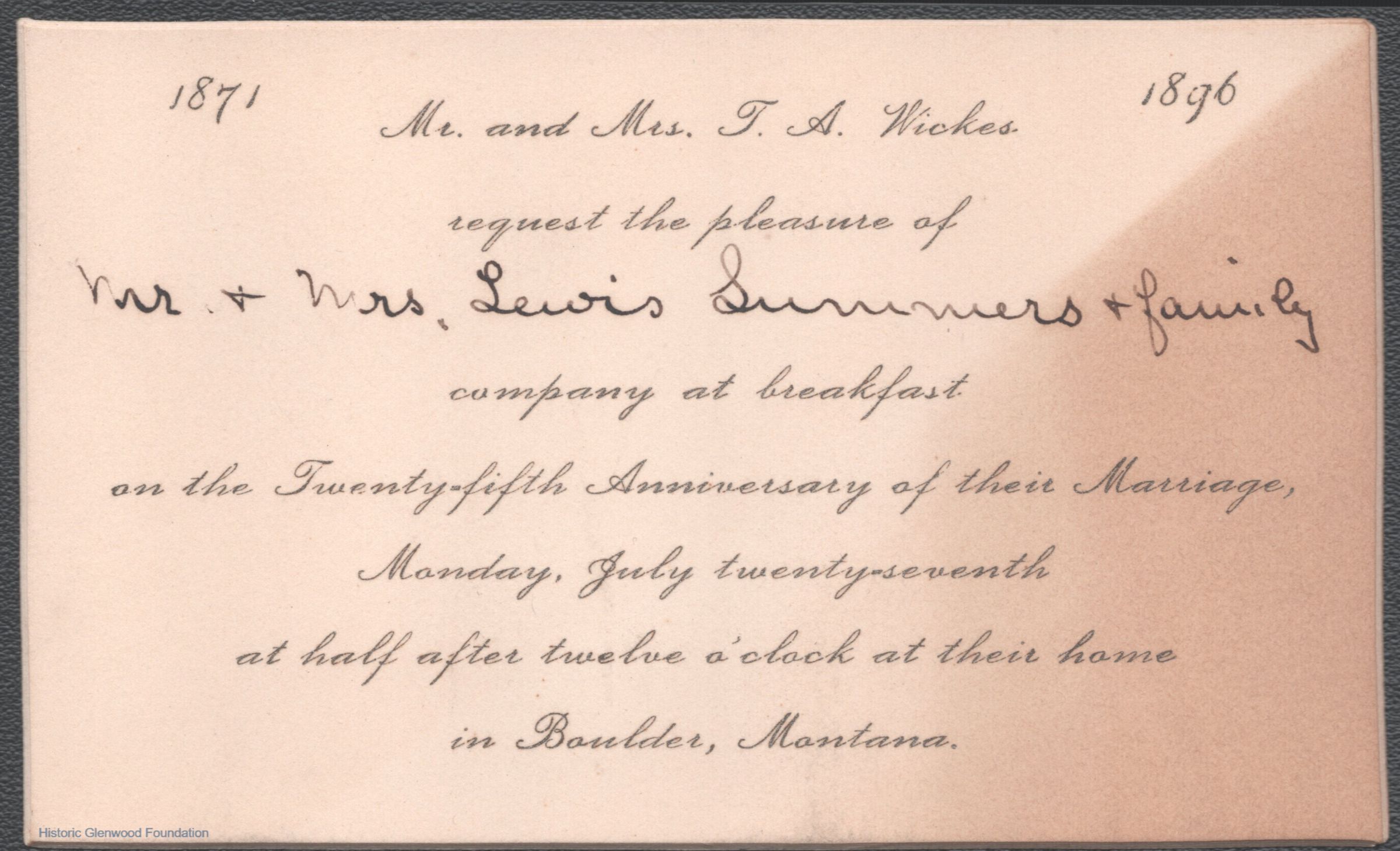 Lewis & Lucy W. Summers, invitation to T. A. Wickes anniversary breakfast, Jul 27, 1896Entry/Object ID