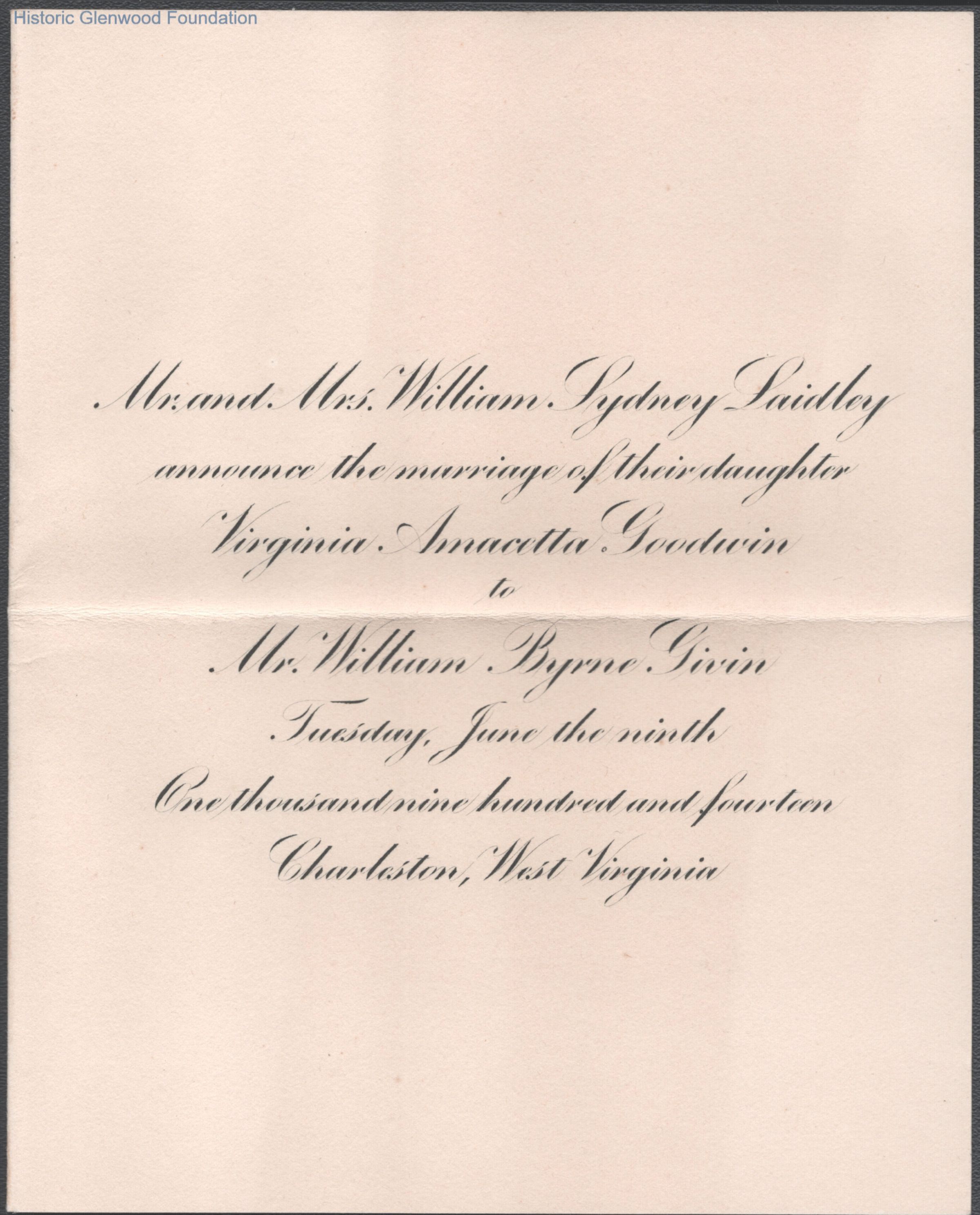 Invitation to Virginia A. G. Laidley and William B. Givin wedding, Jun 9, 1914.Date(s) of Creation