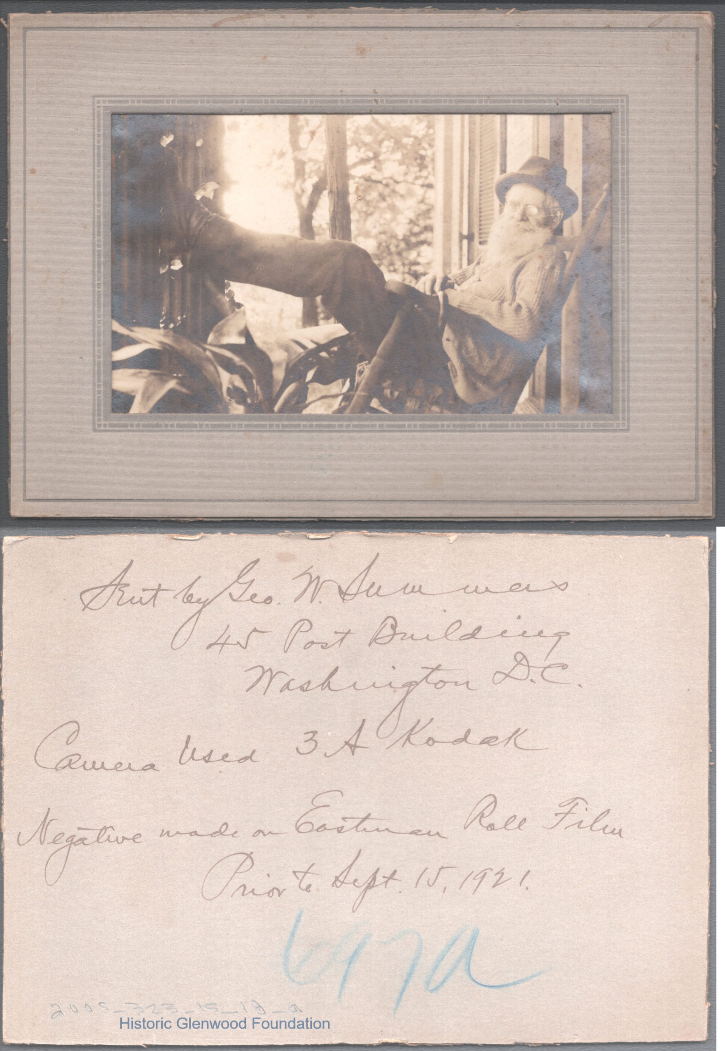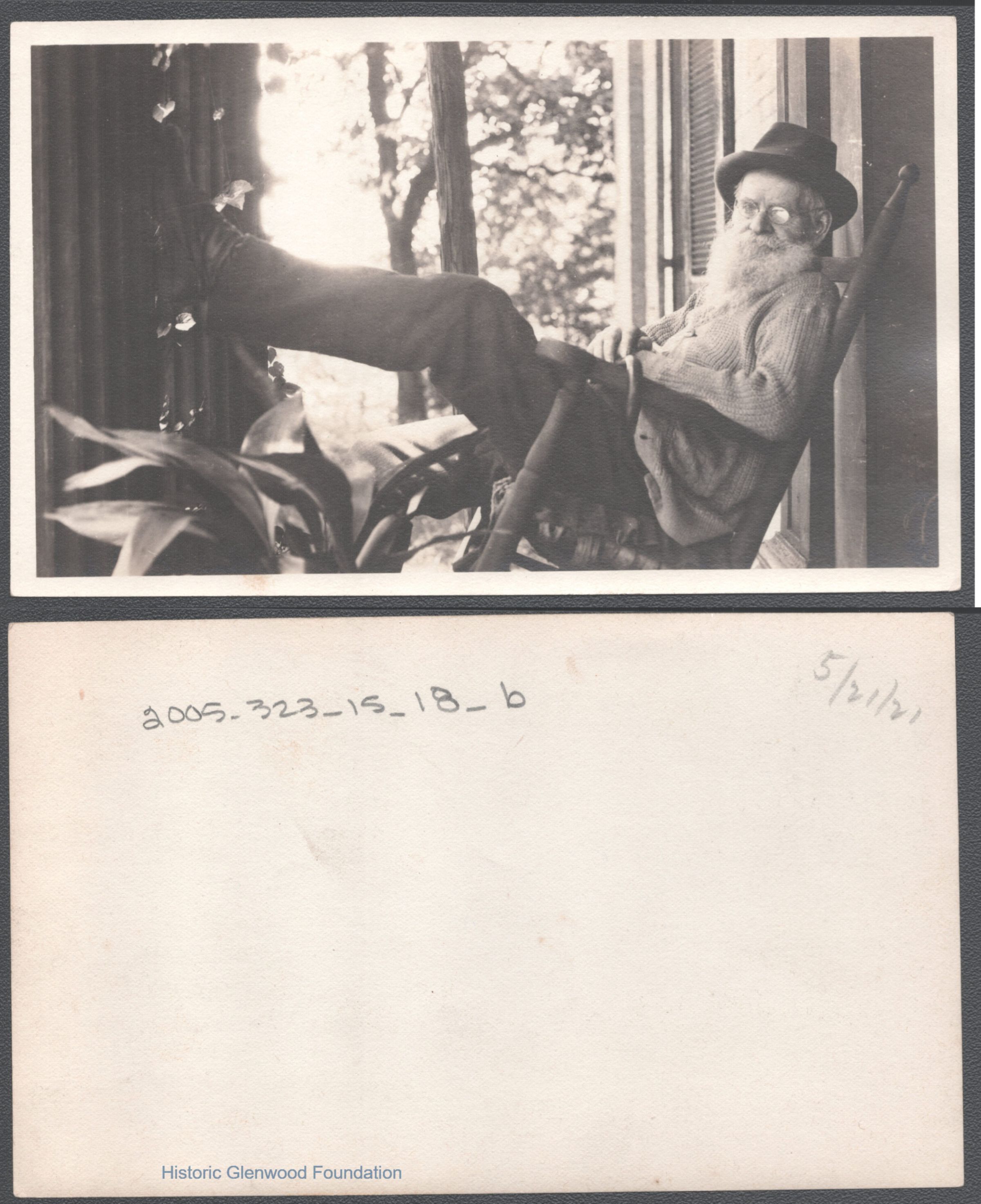 Candid photo of Lewis Summers seated on porch at Glenwood, May 21, 1921. Notes on reverse by George give details on camera and film.