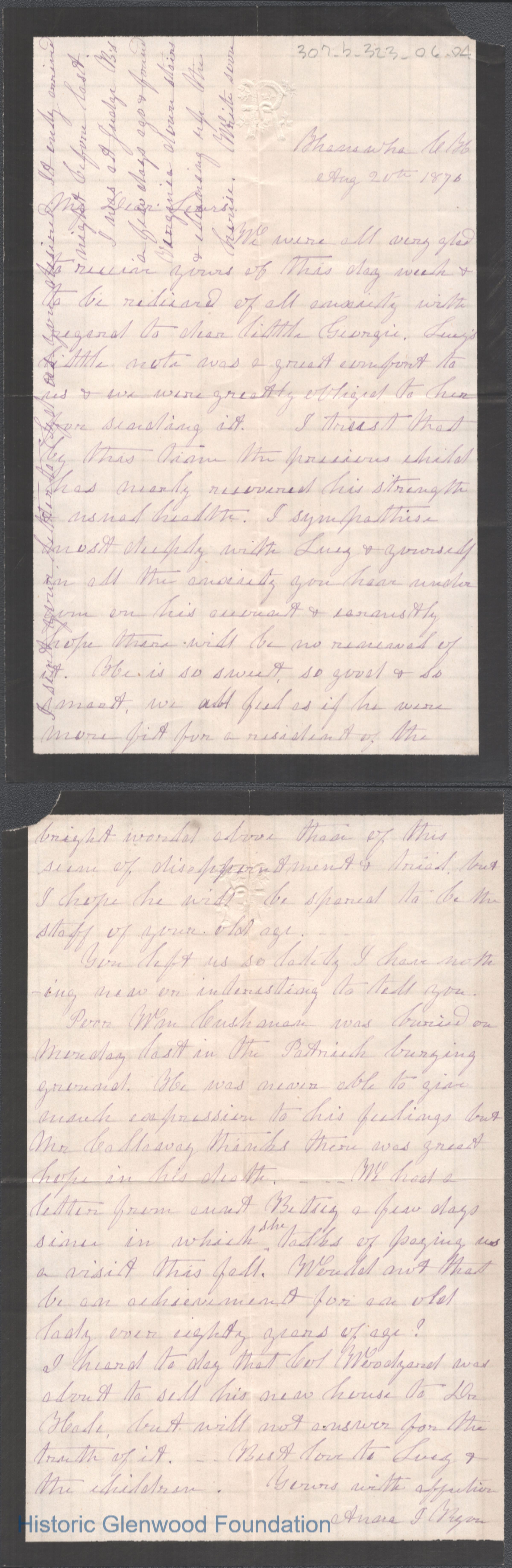 Two-page letter to Lewis Summers from Anna I. S. Ryon, Aug 20, 1876.