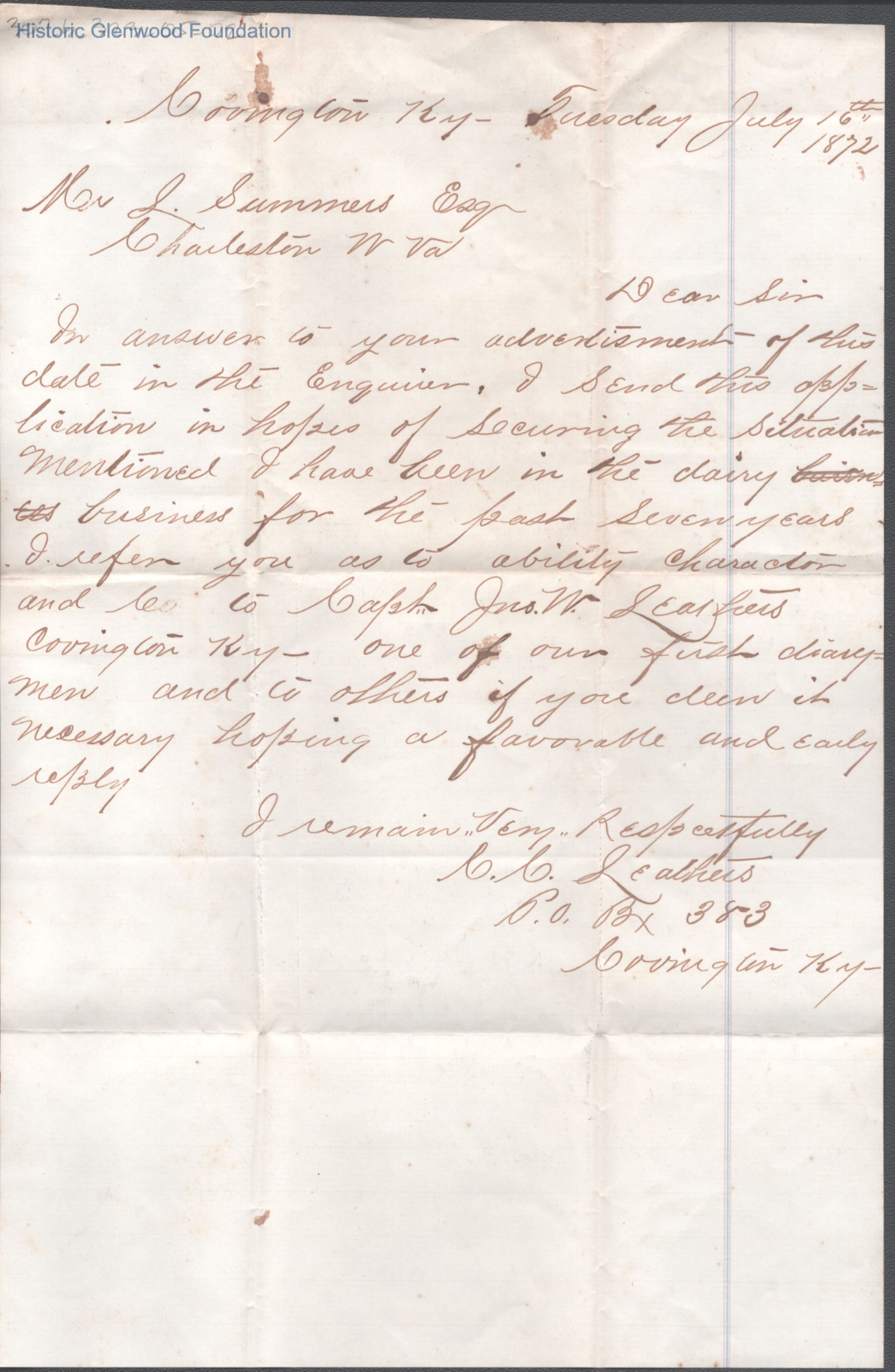 Lewis Summers from C. C. Leathers, Jul 16, 1872