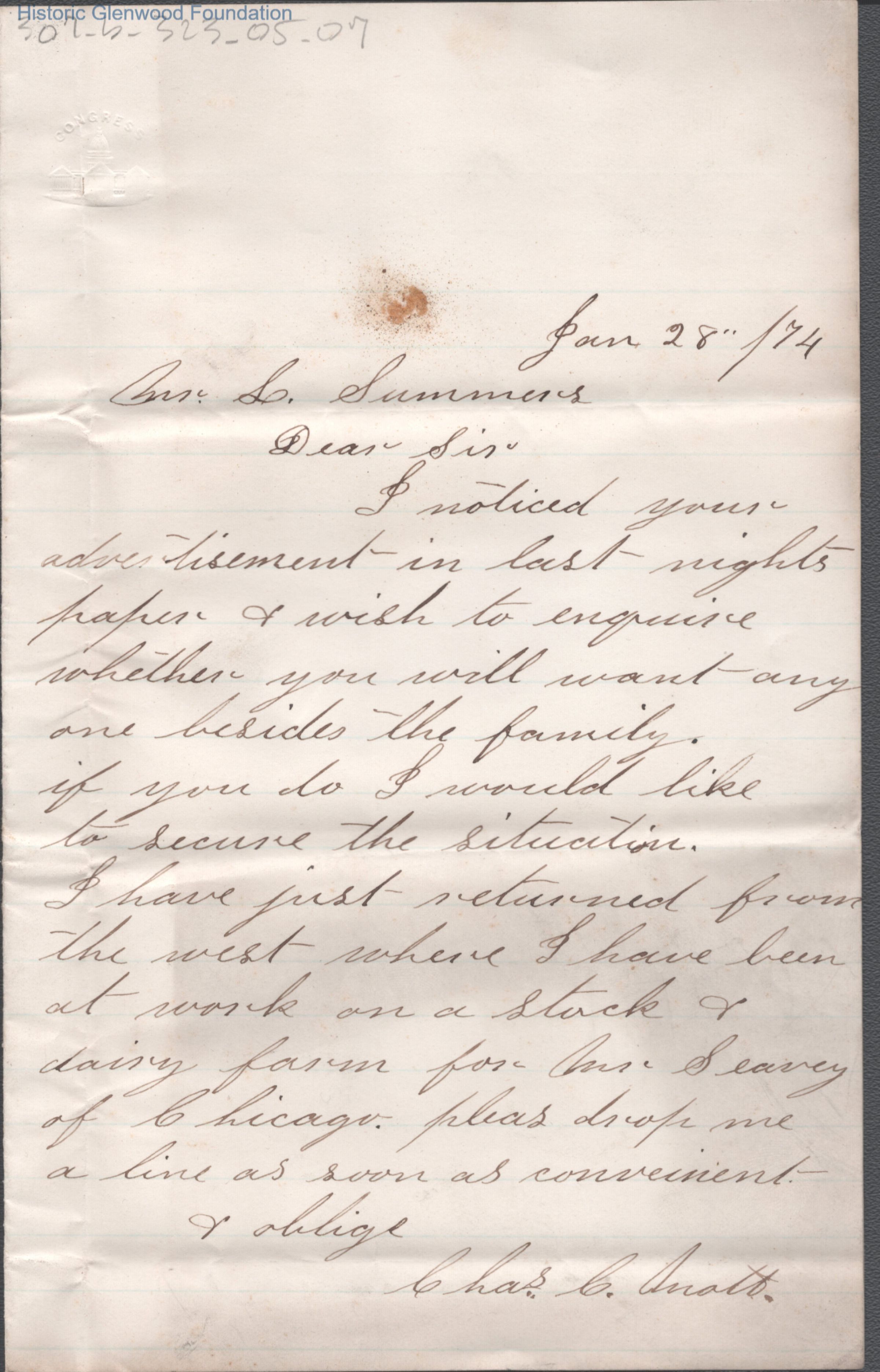 Lewis Summers from Charles C. Anott, Jan 28, 1874