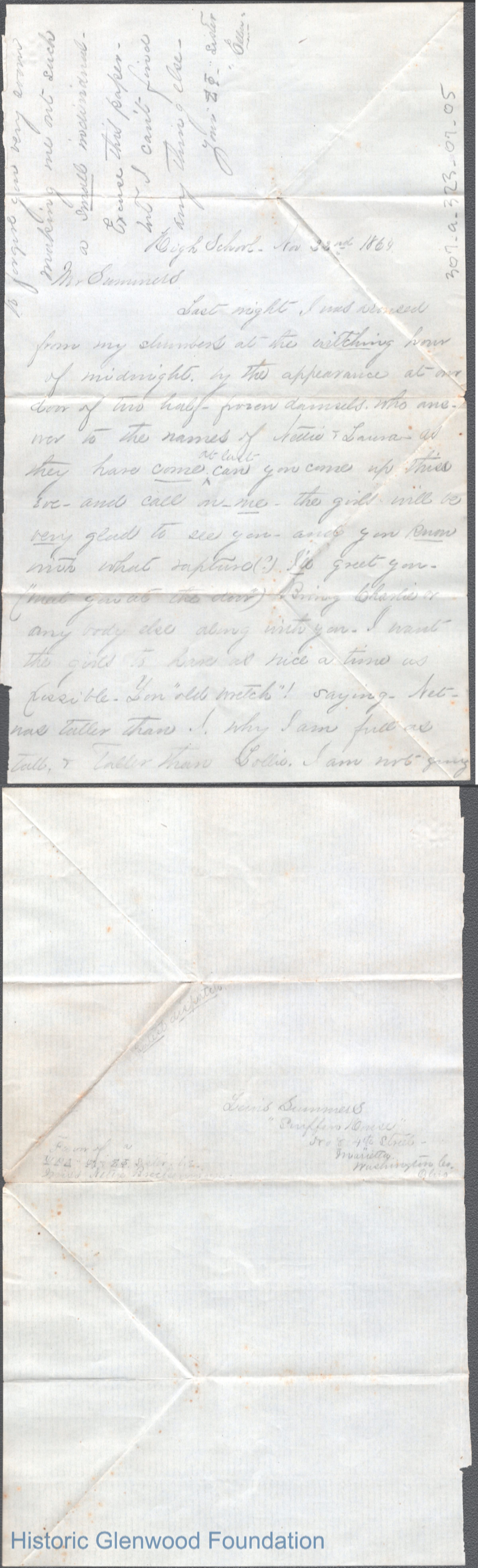 Lewis Summers from Ella, a Marietta College classmate, Nov 22, 1864