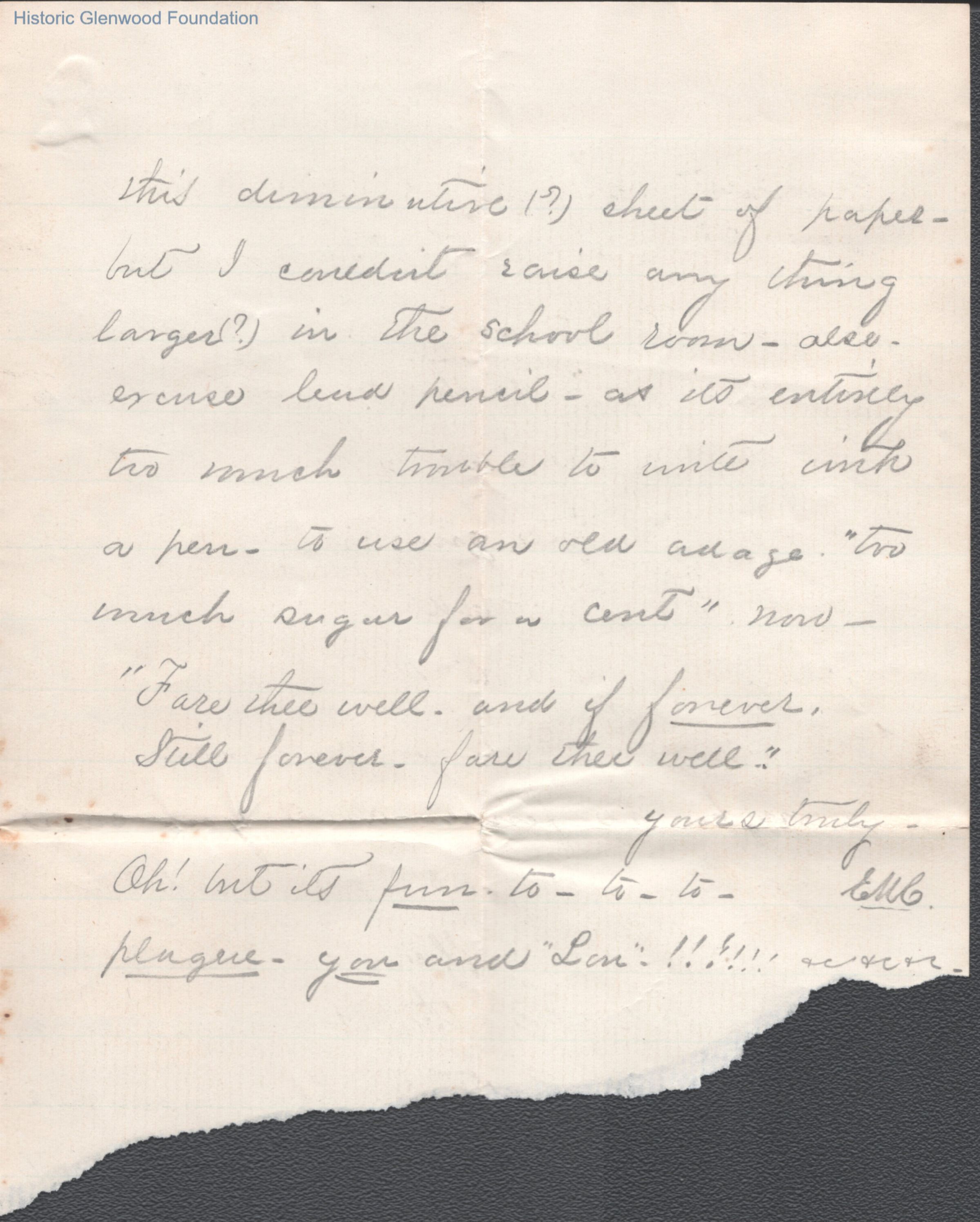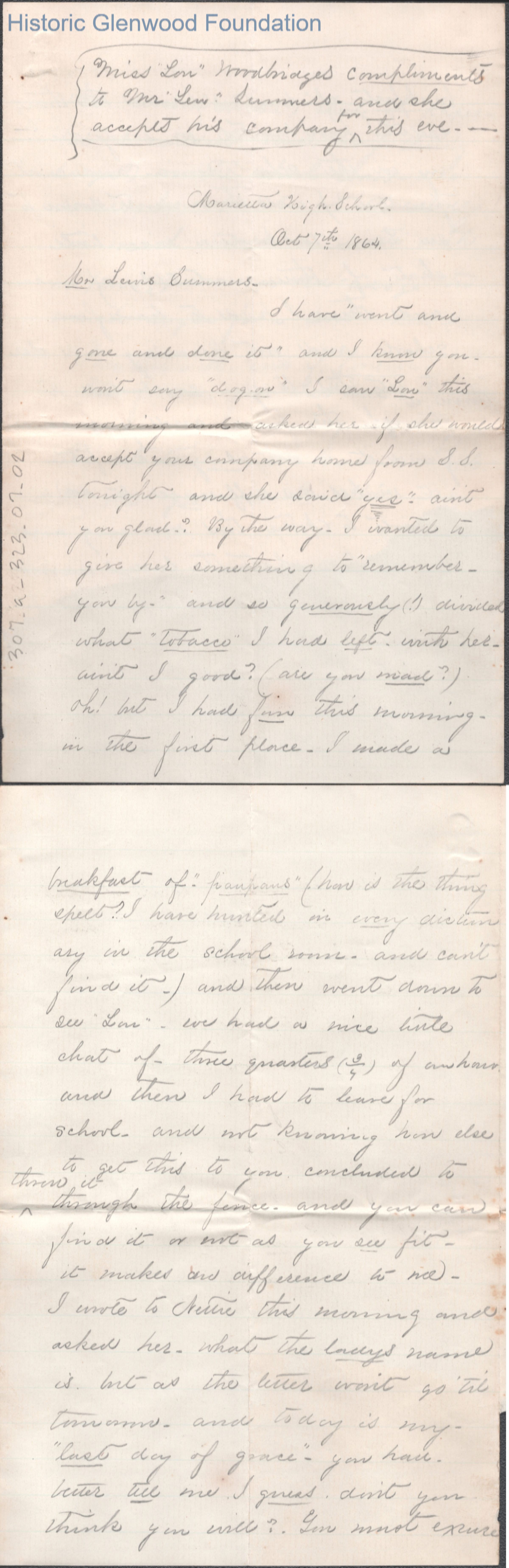 Three-page letter to Lewis Summers from "Ella M. C.," Marietta classmate, Oct 7, 1864.