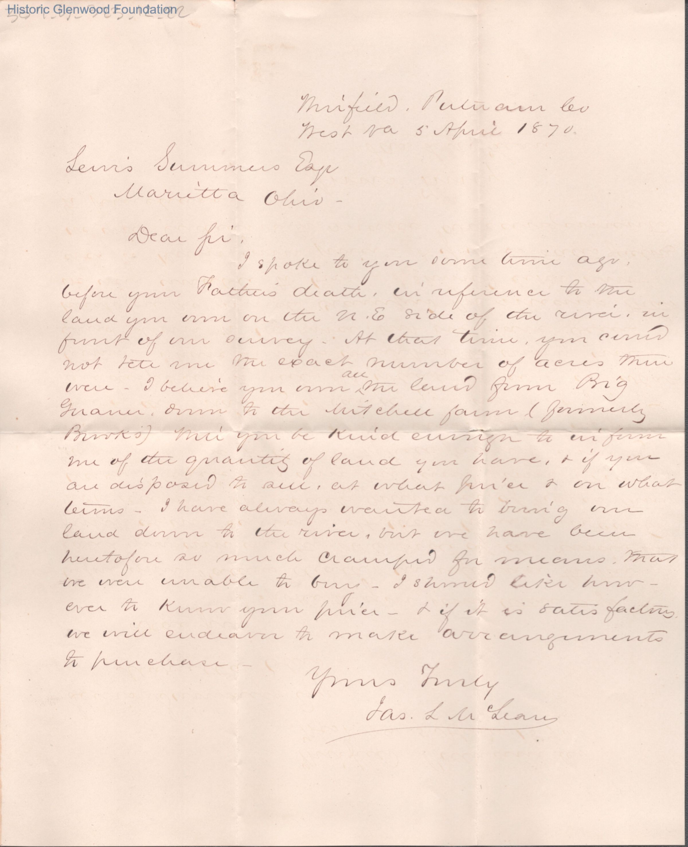 Single page letter to Lewis Summers from James L. McLean, Apr 5, 1870.