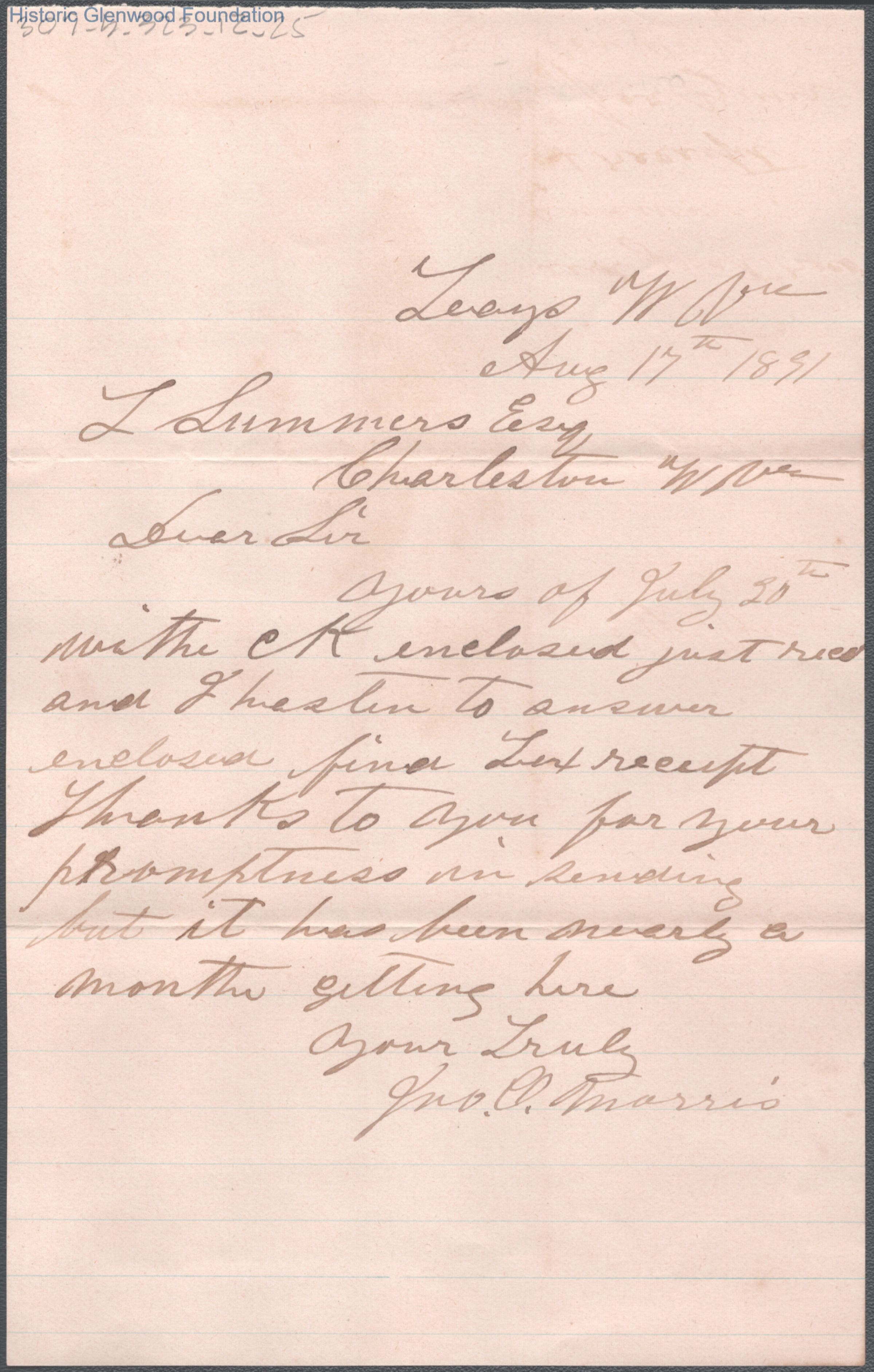 Lewis Summers from John C. Morris, Aug 17, 1891