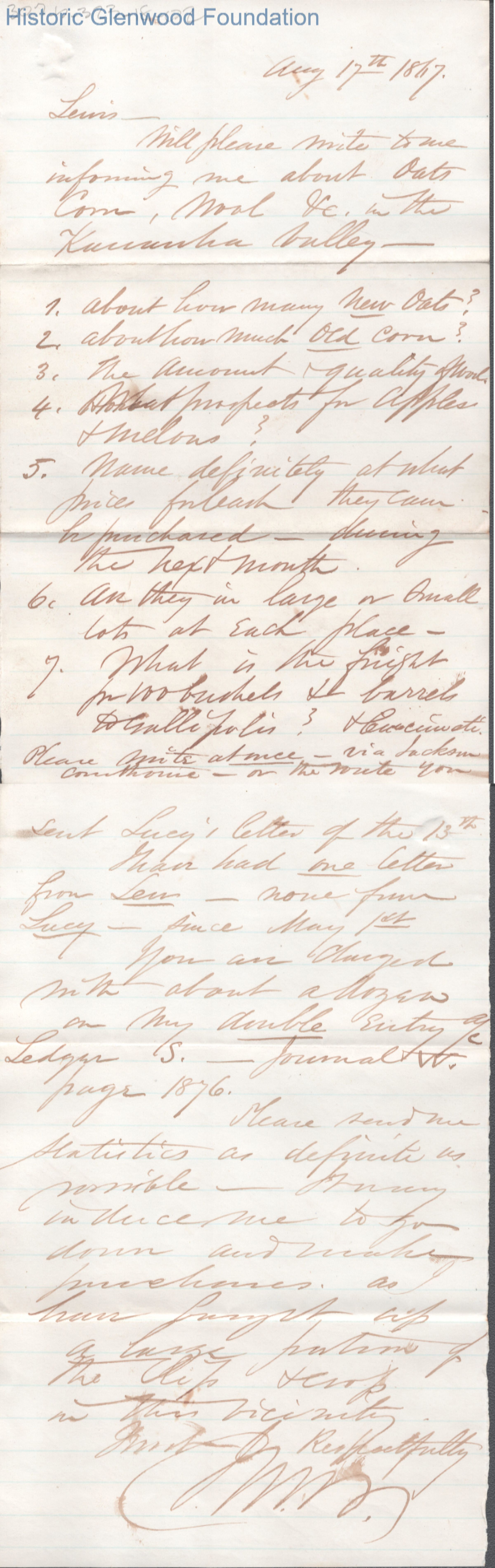 Two-page letter to Lewis Summers from John M. Woodbridge, Aug 17, 1867.