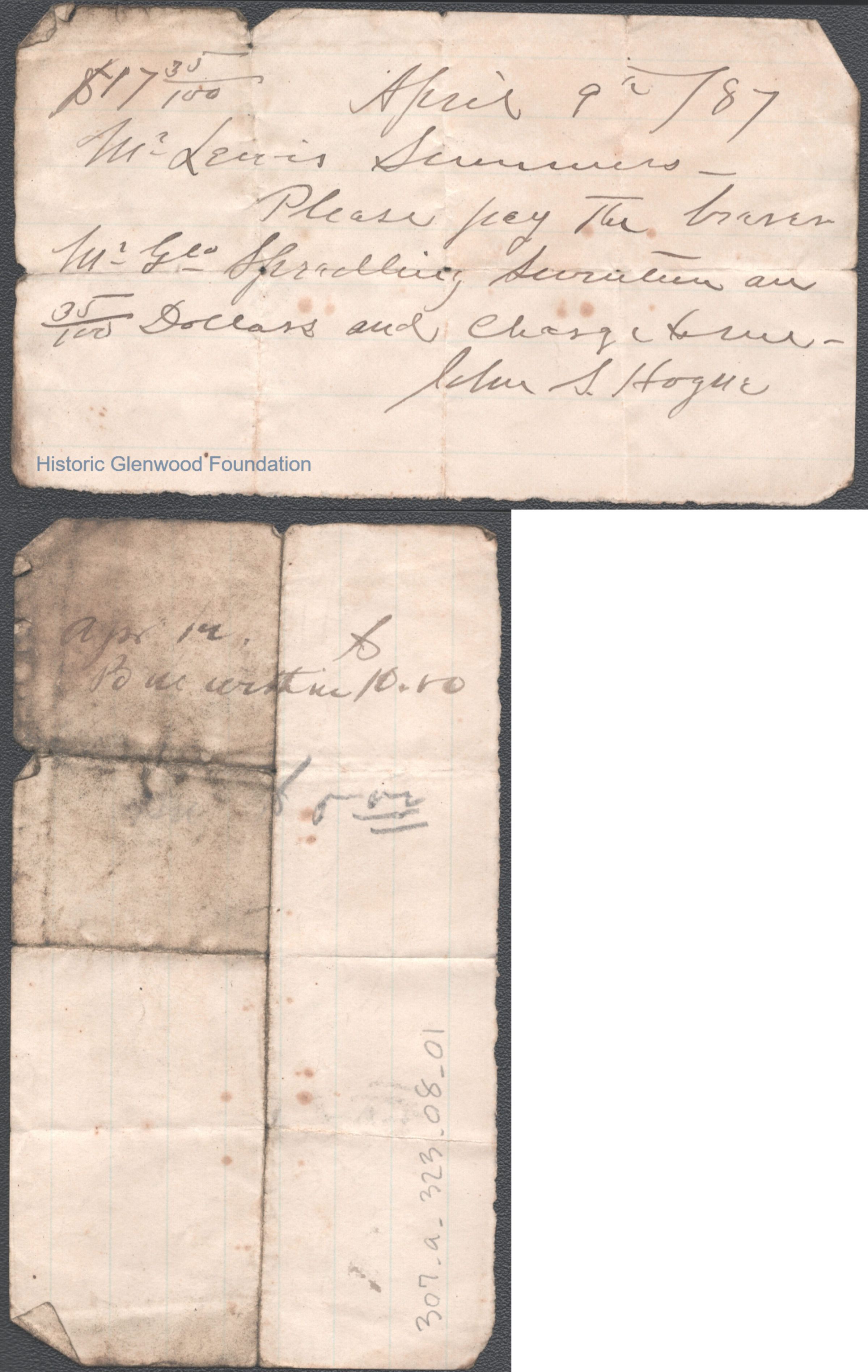 Two-page note to Lewis Summers from John S. Hogue, Apr 9, 1887.