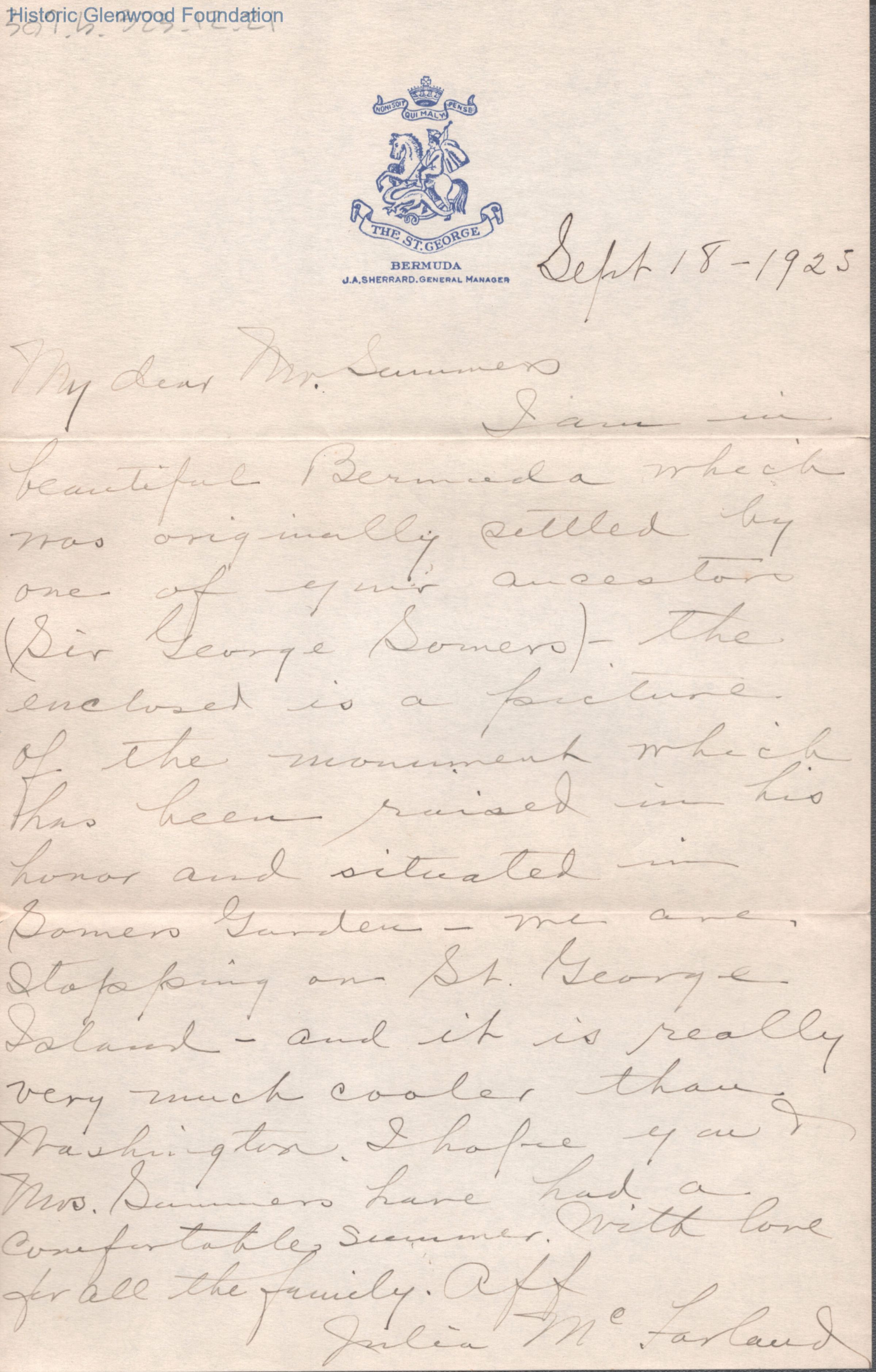 Lewis Summers from Julia McFarland, Sep 18, 1925