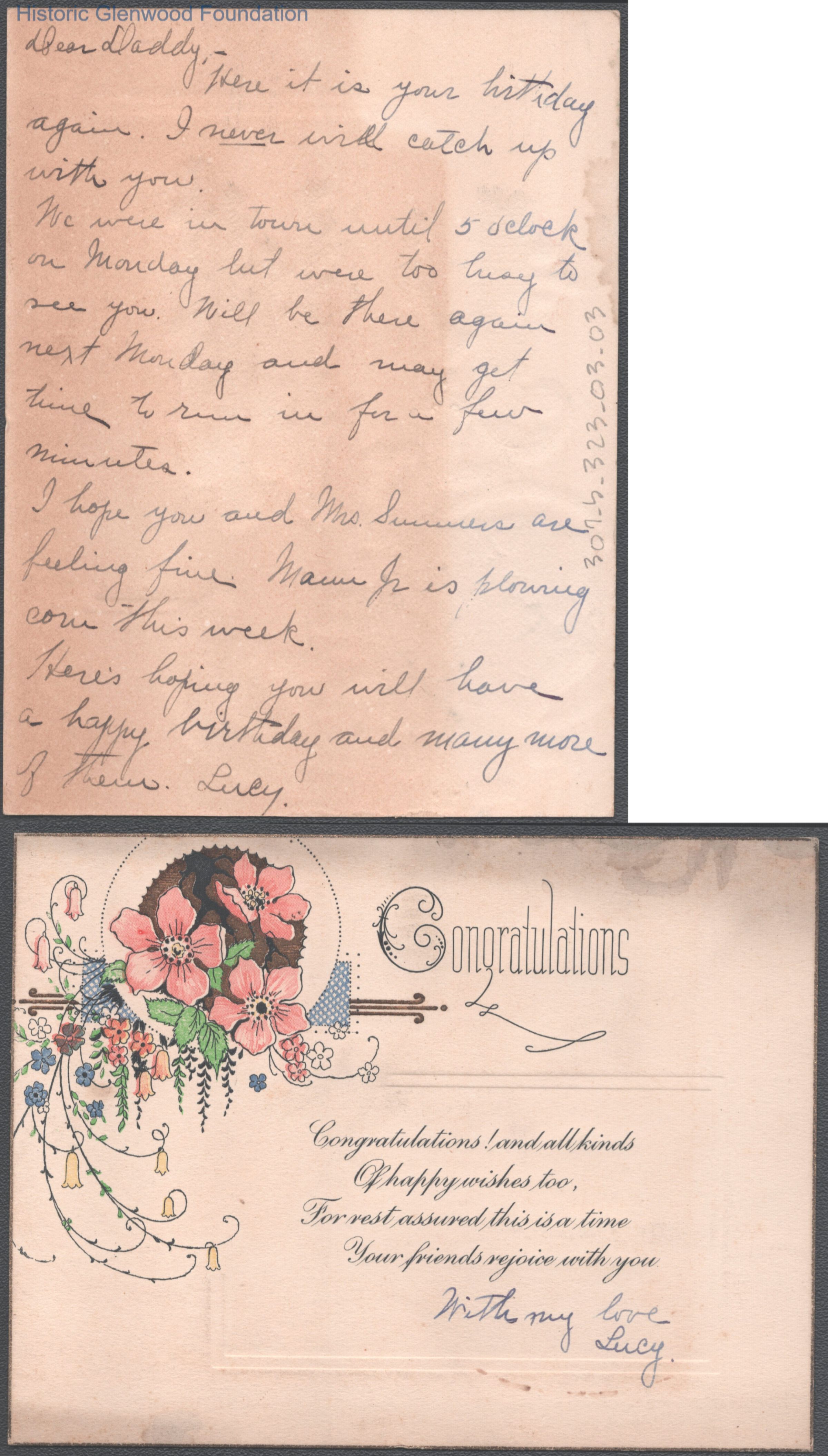 Card to Lewis Summers from granddaughter Lucy S. Quarrier, no date.