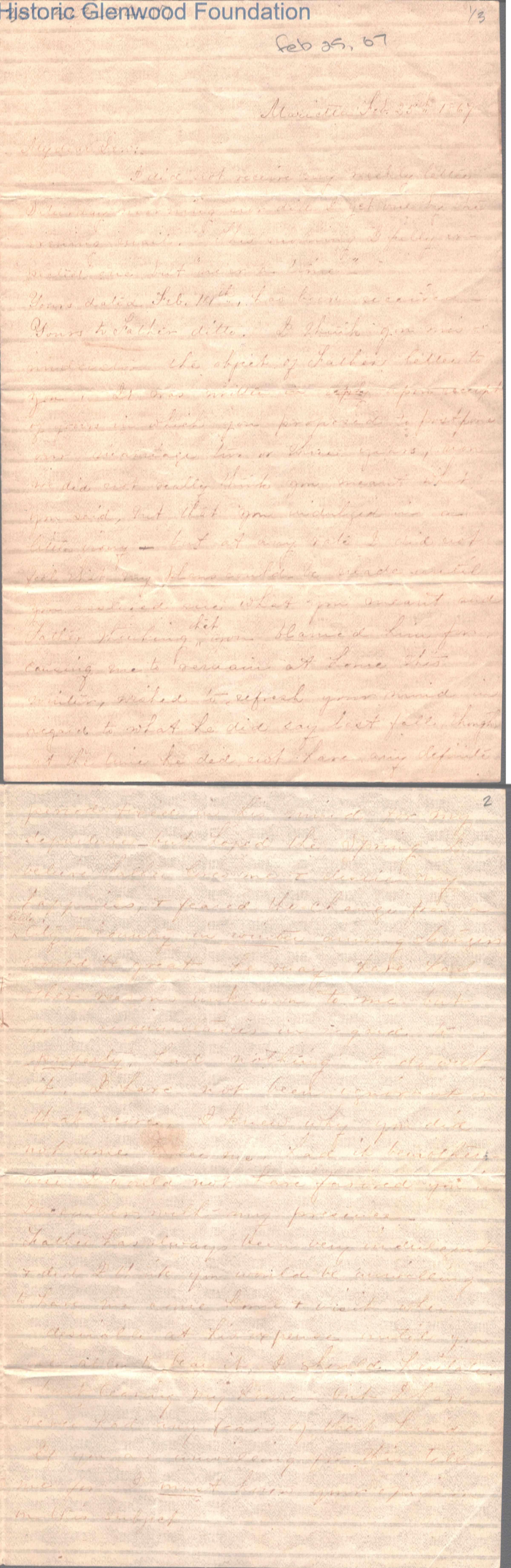 Three-page letter to Lewis Summers from Lucy W. Summers, Feb 25, 1867.