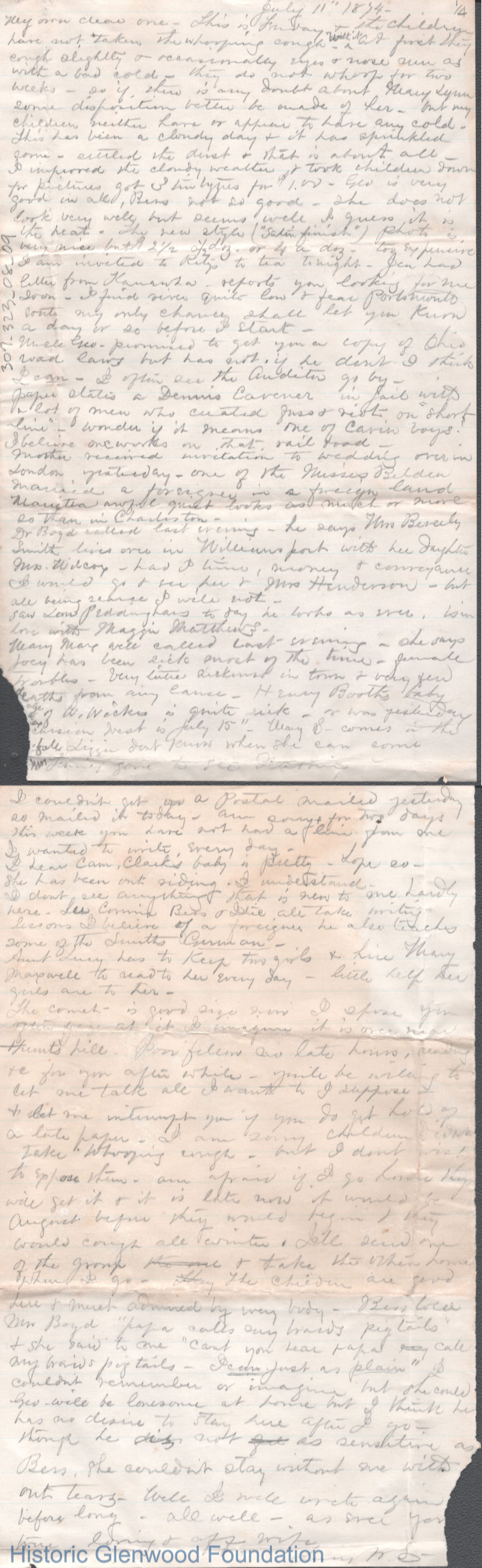 Four-page letter to Lewis Summers from Lucy W. Summers, Jul 11, 1874.