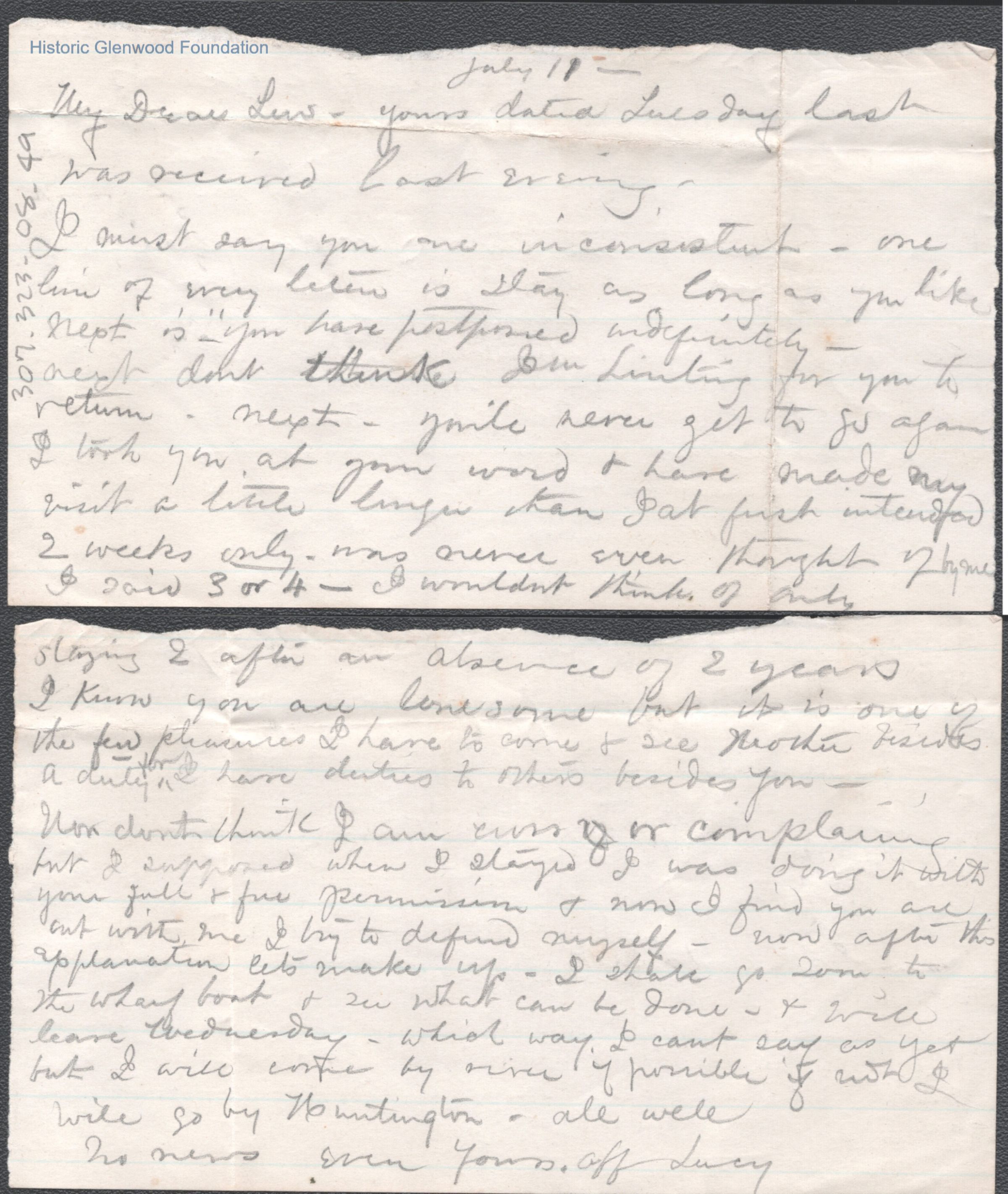 Two-page letter to Lewis Summers from Lucy W. Summers, unknown year ("July 11" noted).