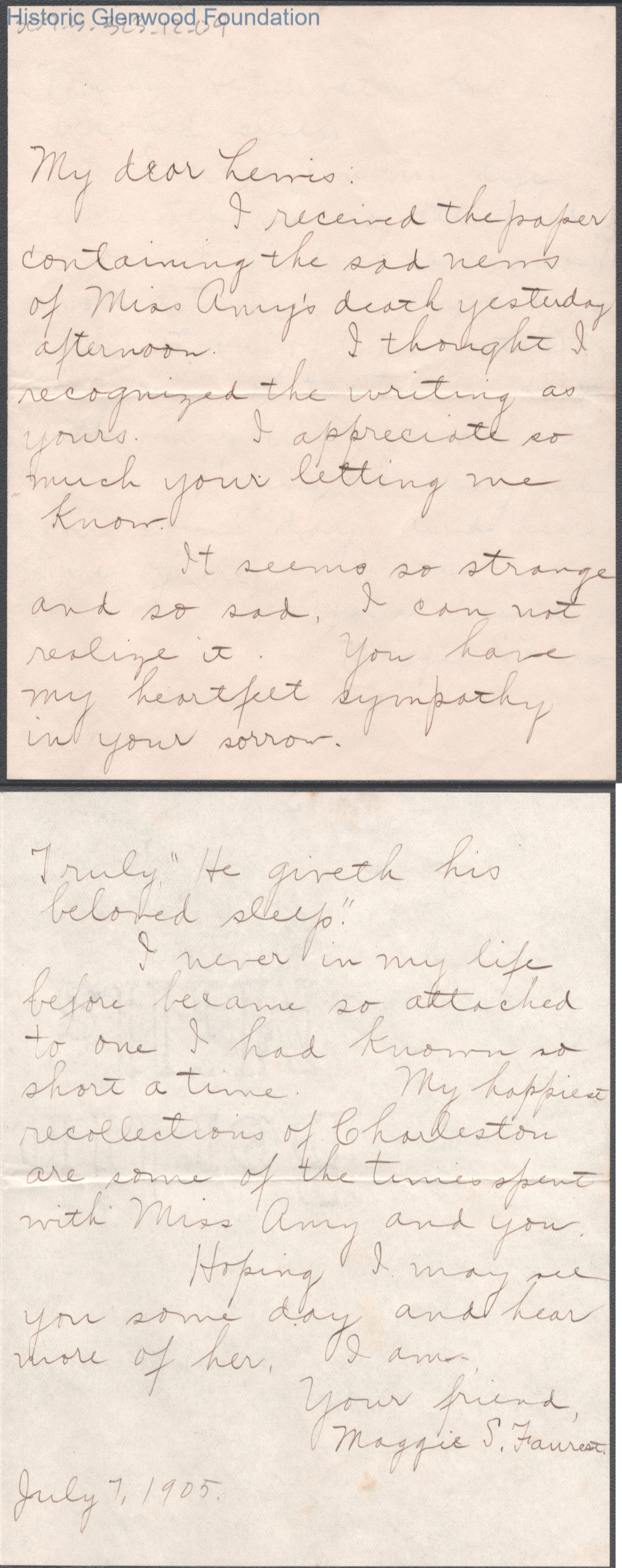 Two-page letter to Lewis Summers from Maggie S. Faurest, Jul 7, 1905.