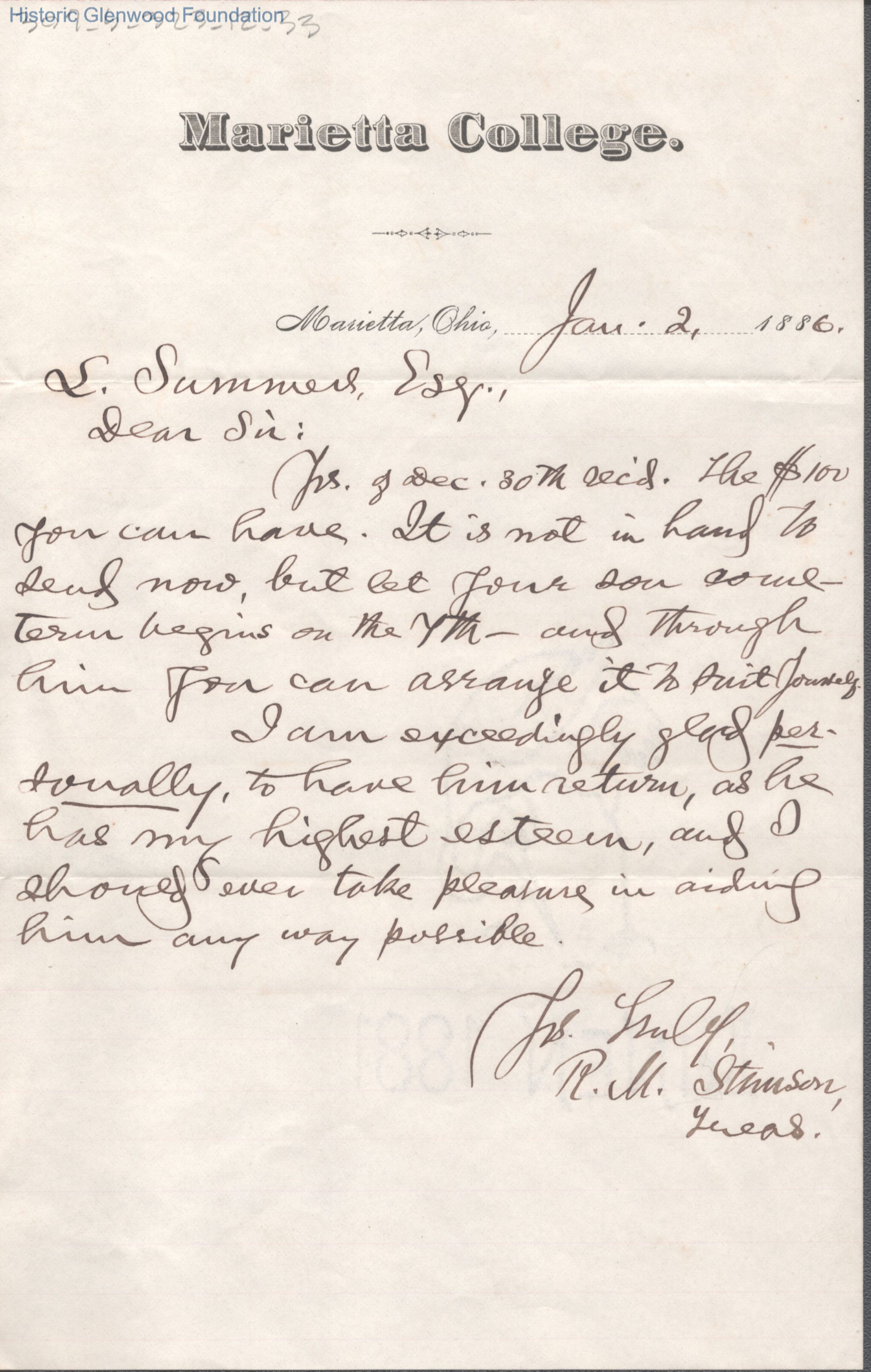 Single page letter to Lewis Summers from R. M. Stinson, Jan 2, 1886.