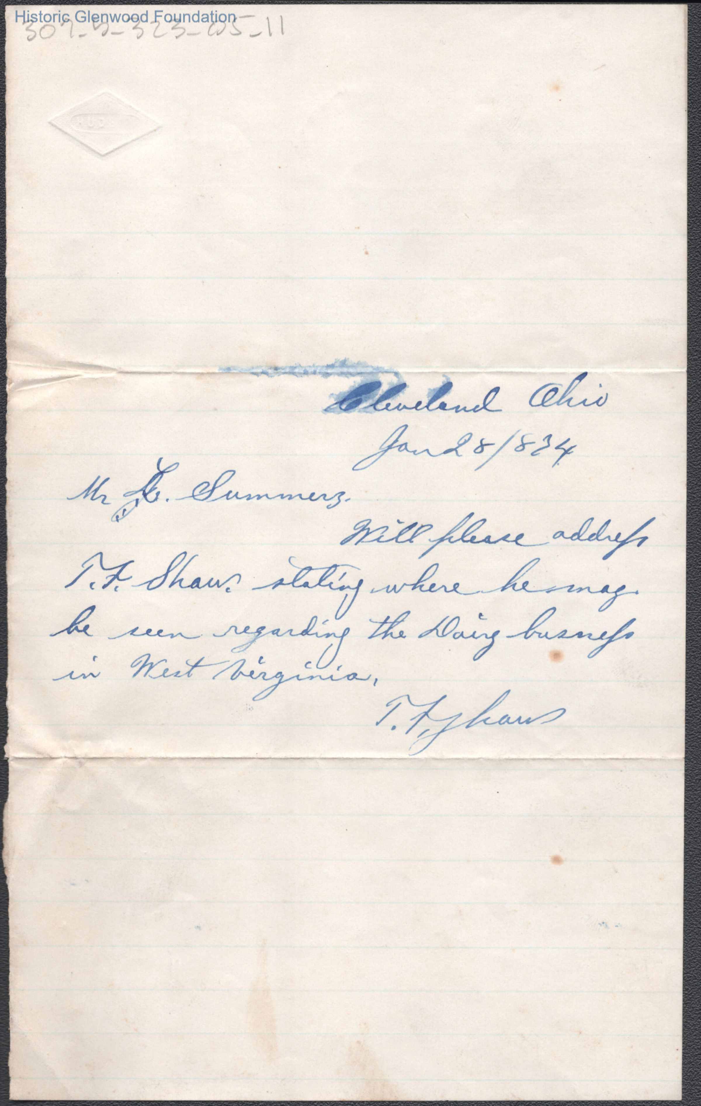 Single page letter to Lewis Summers from T. F. Shaw, Jan 28, 1874.