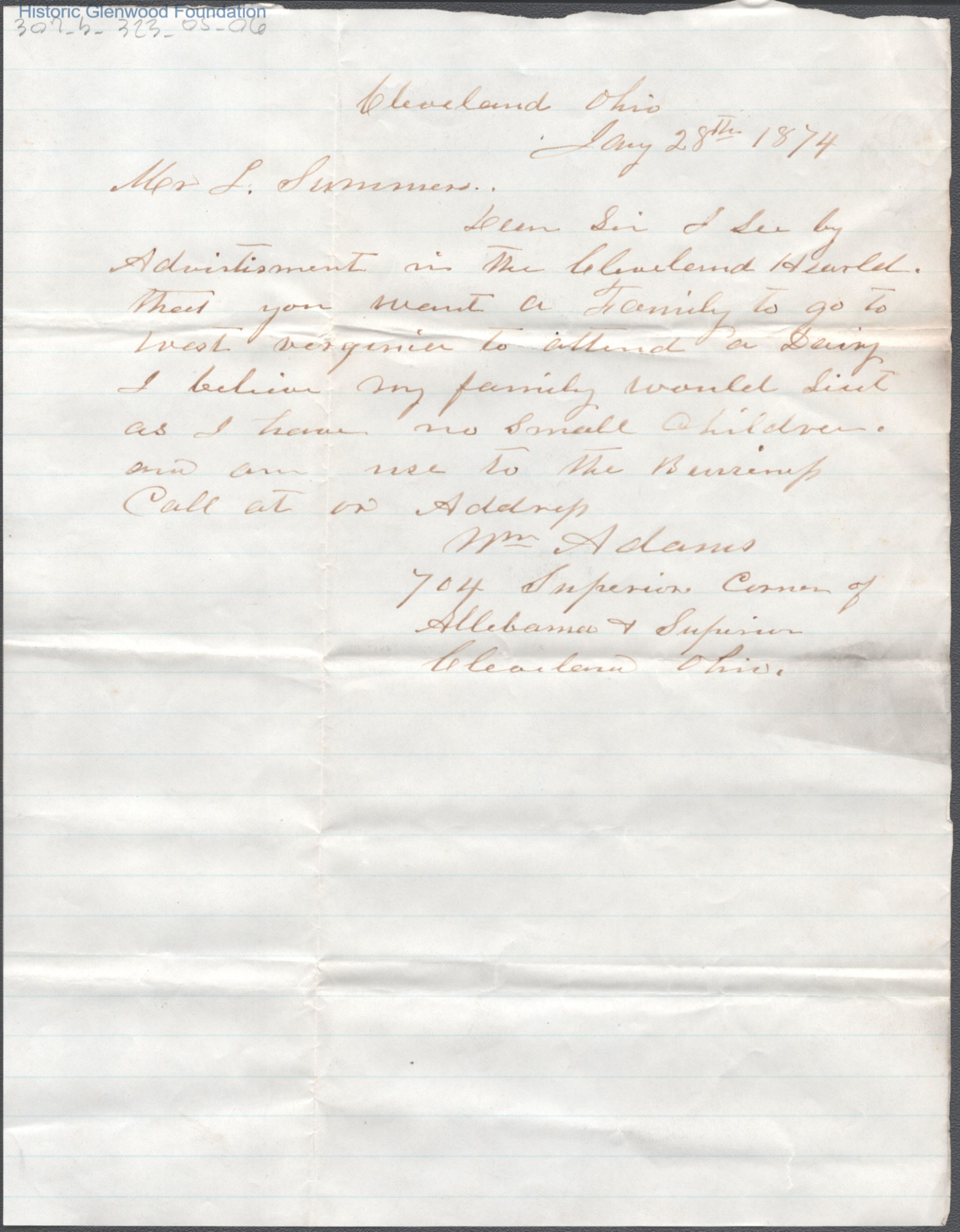 Single page letter to Lewis Summers from William Adams, Jan 28, 1874.