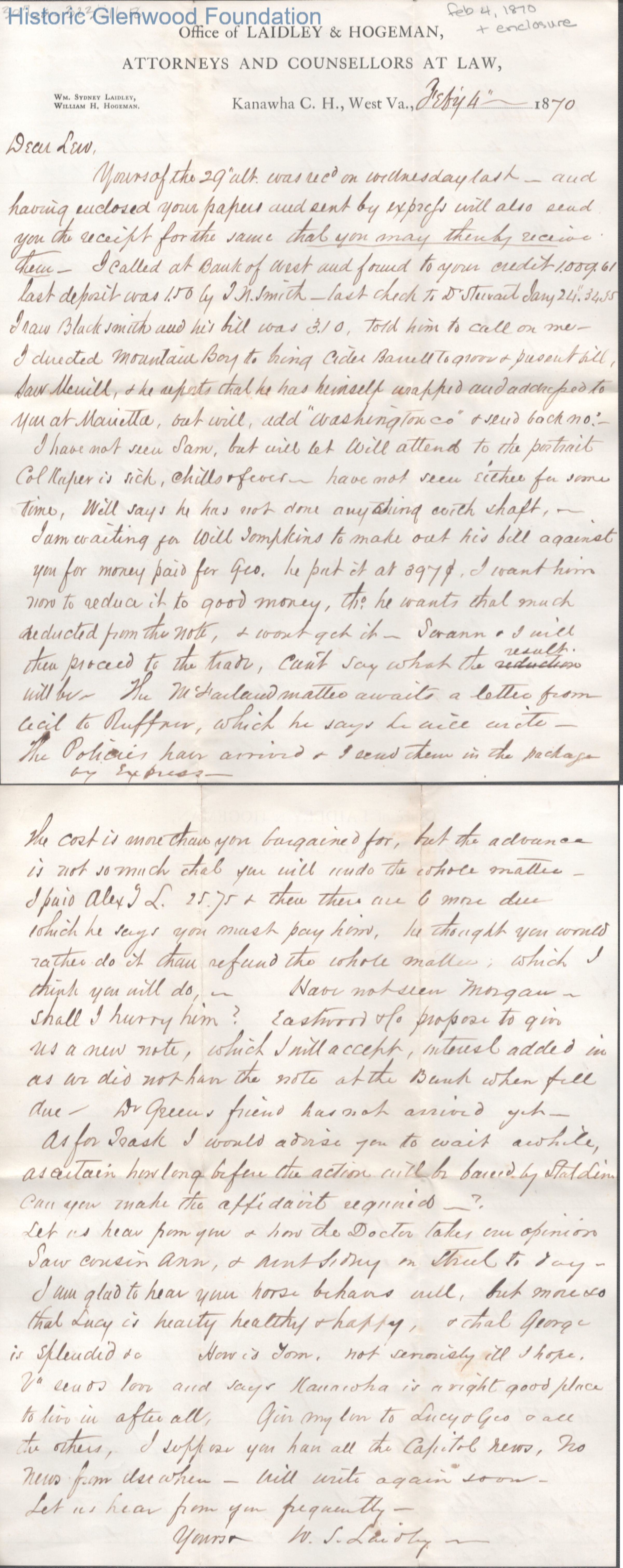 Two-page letter and enclosure to Lewis Summers from his uncle William S. Laidley, Feb 4, 1870.