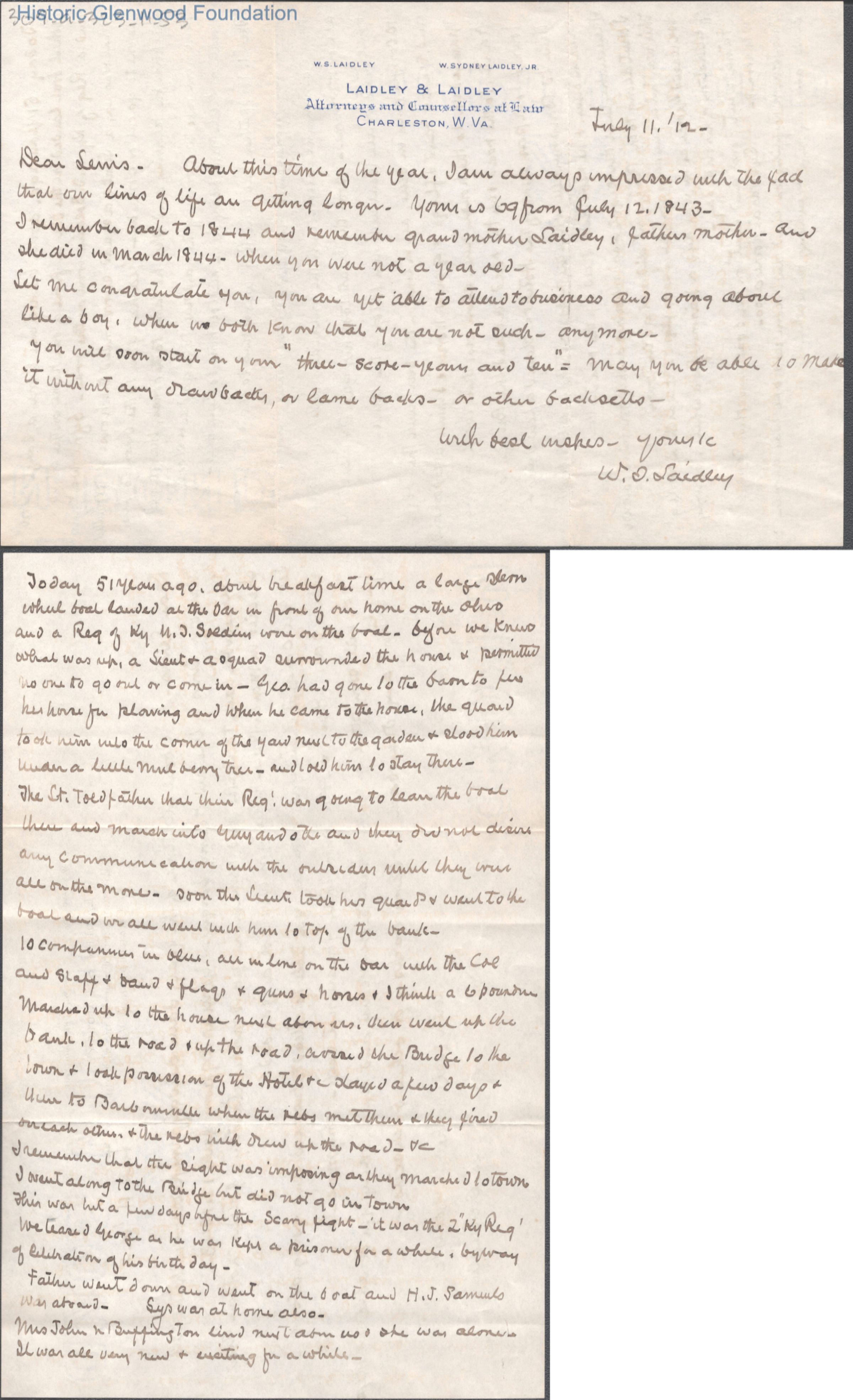 Two-page letter to Lewis Summers from uncle William S. Laidley, Jul 11, 1912.