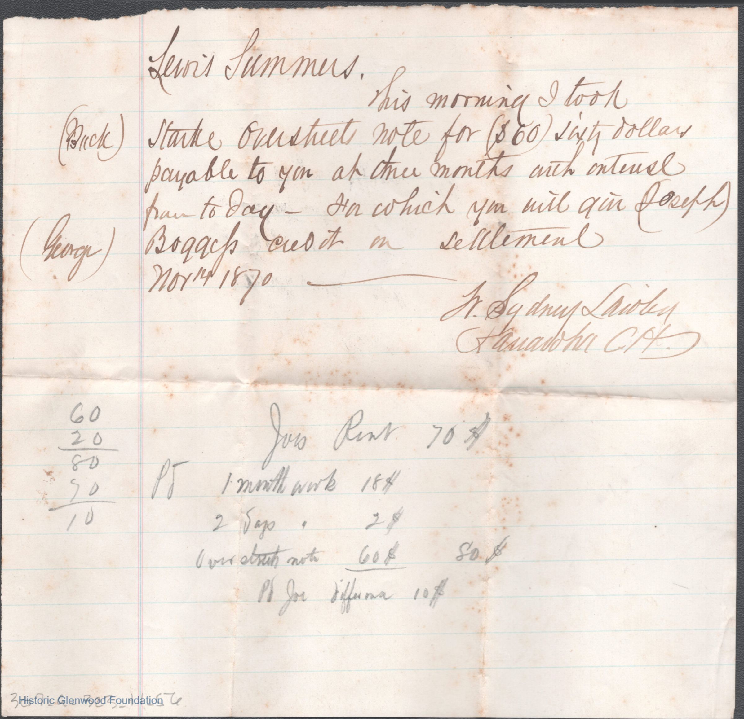 Single page note to Lewis Summers from uncle William S. Laidley, Nov 14, 1870.