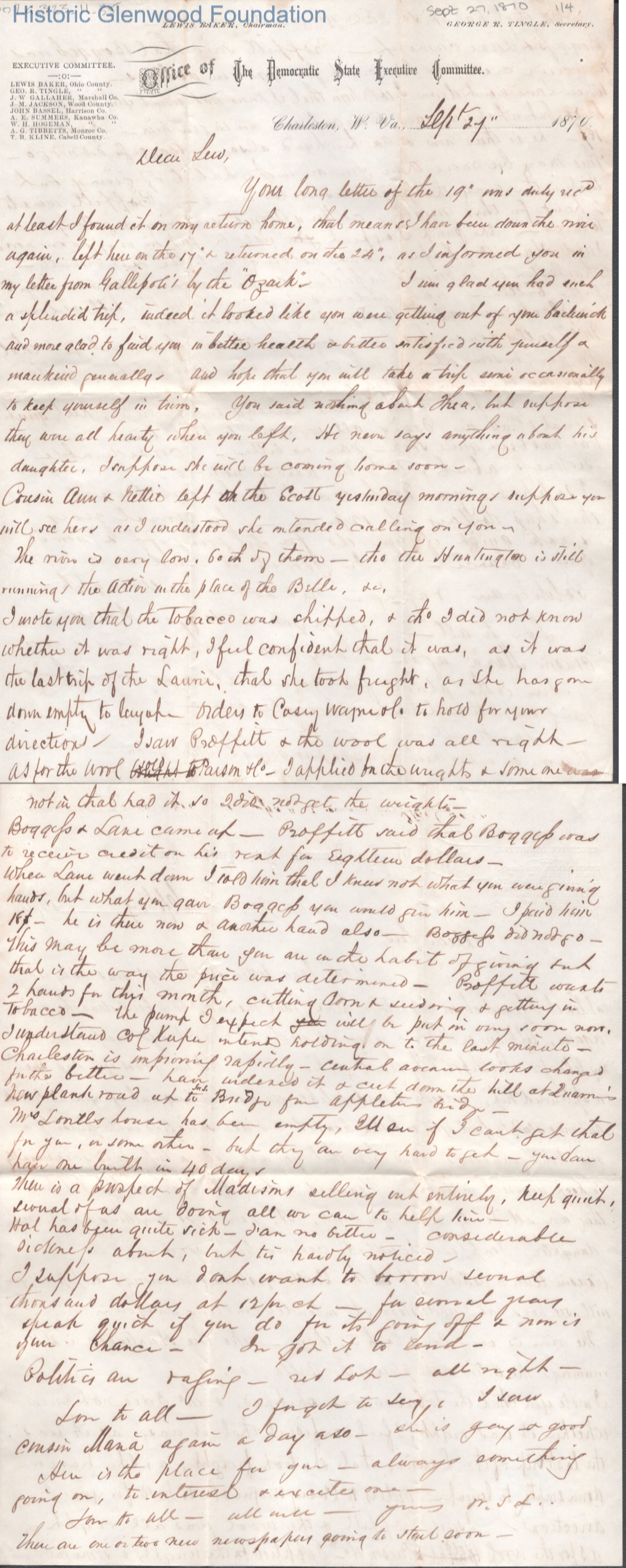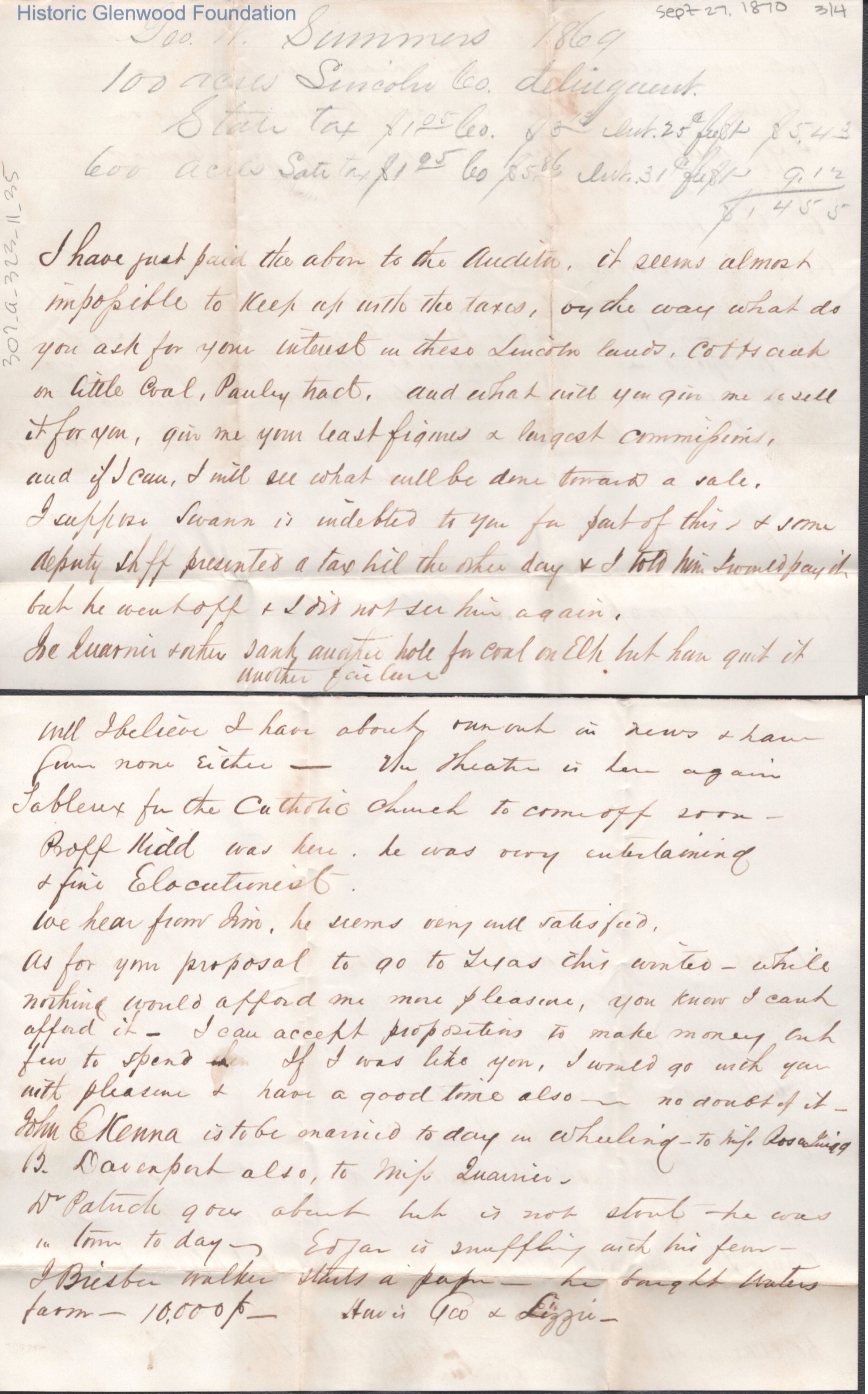 Four-page letter to Lewis Summers from his uncle William S. Laidley, Sep 27, 1870.