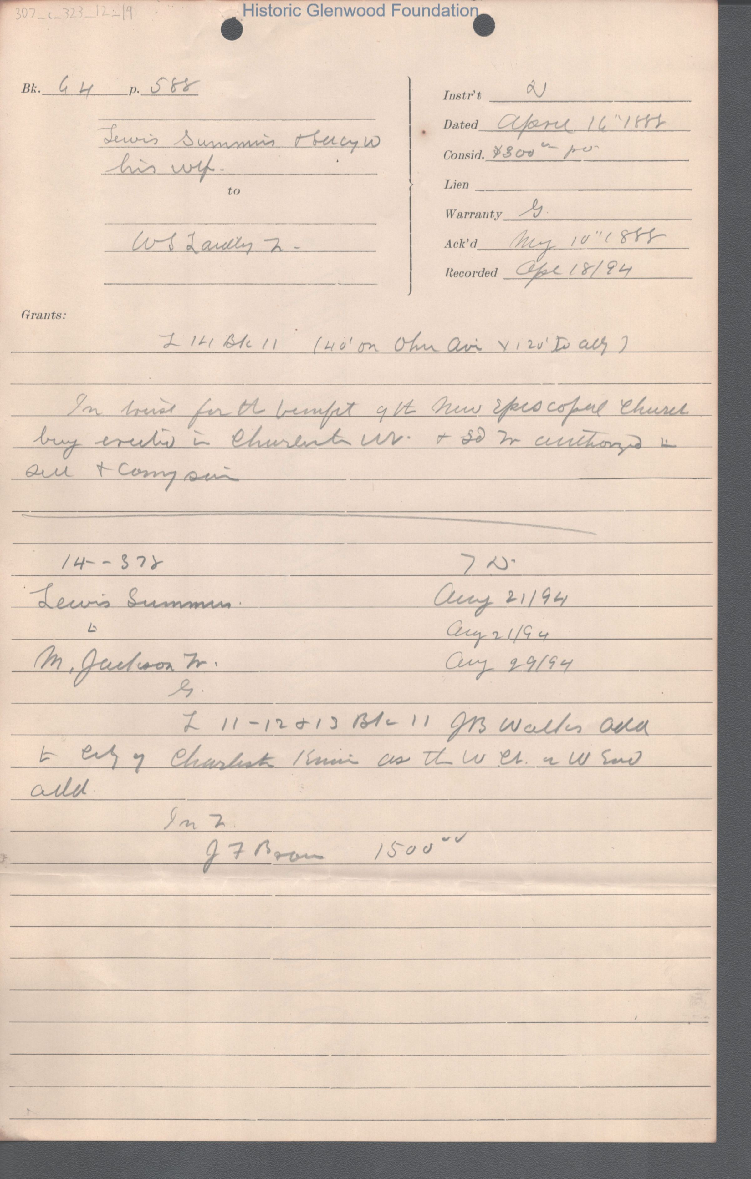 Record of property sale of one lot on Ohio Ave. in Charleston by Lewis & Lucy W. Summers to W. S. Laidley in trust for the benefit of the new Episcopal church; April 16, 1888
