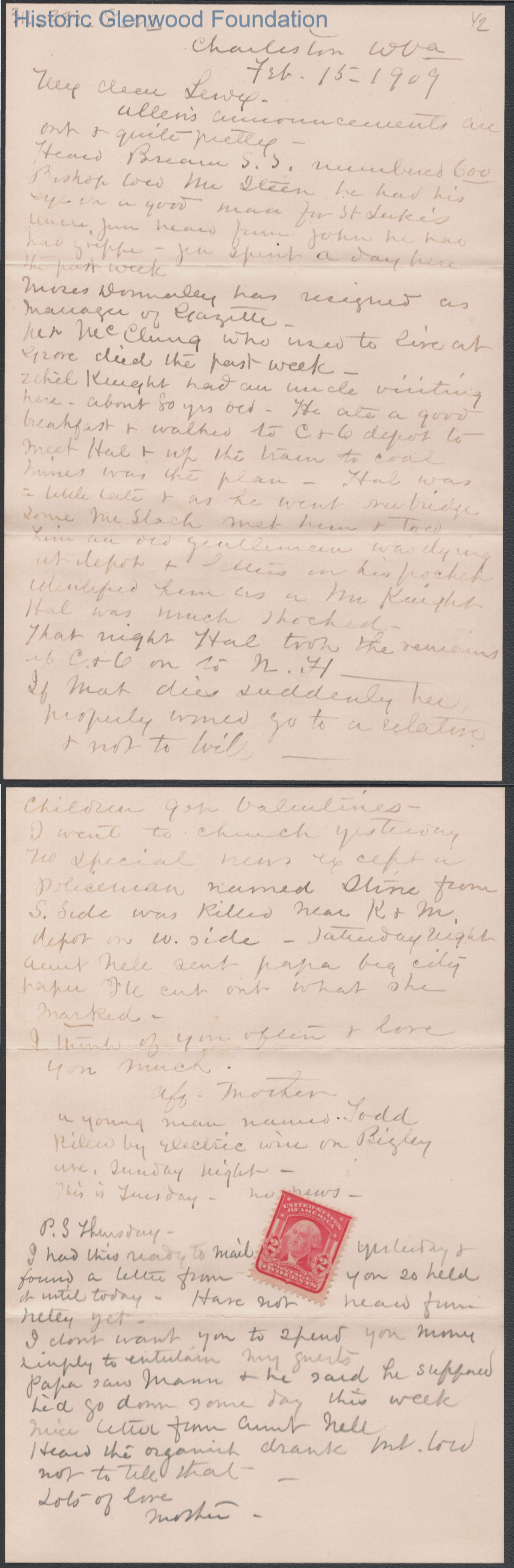 Two-page letter to Lewis Summers, Jr. from his mother Lucy W. Summers, Feb 15, 1909.