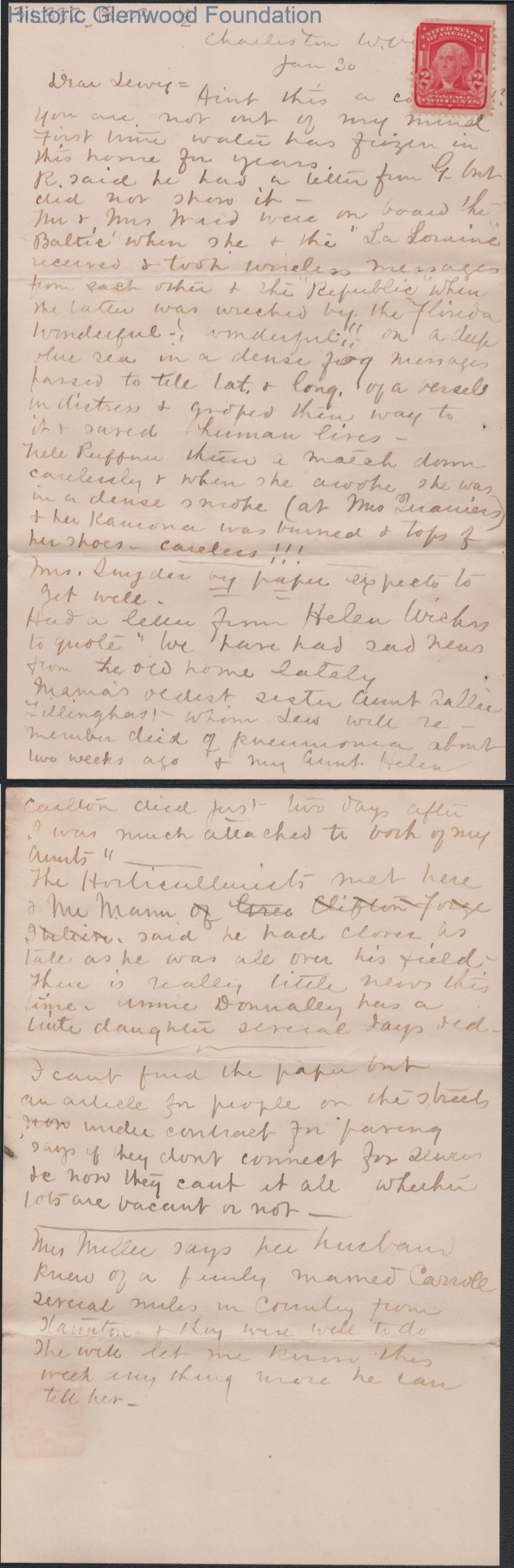 Two-page letter to Lewis Summers, Jr. from his mother Lucy W. Summers. The letter was written on Jan 30, year unknown.Creator
