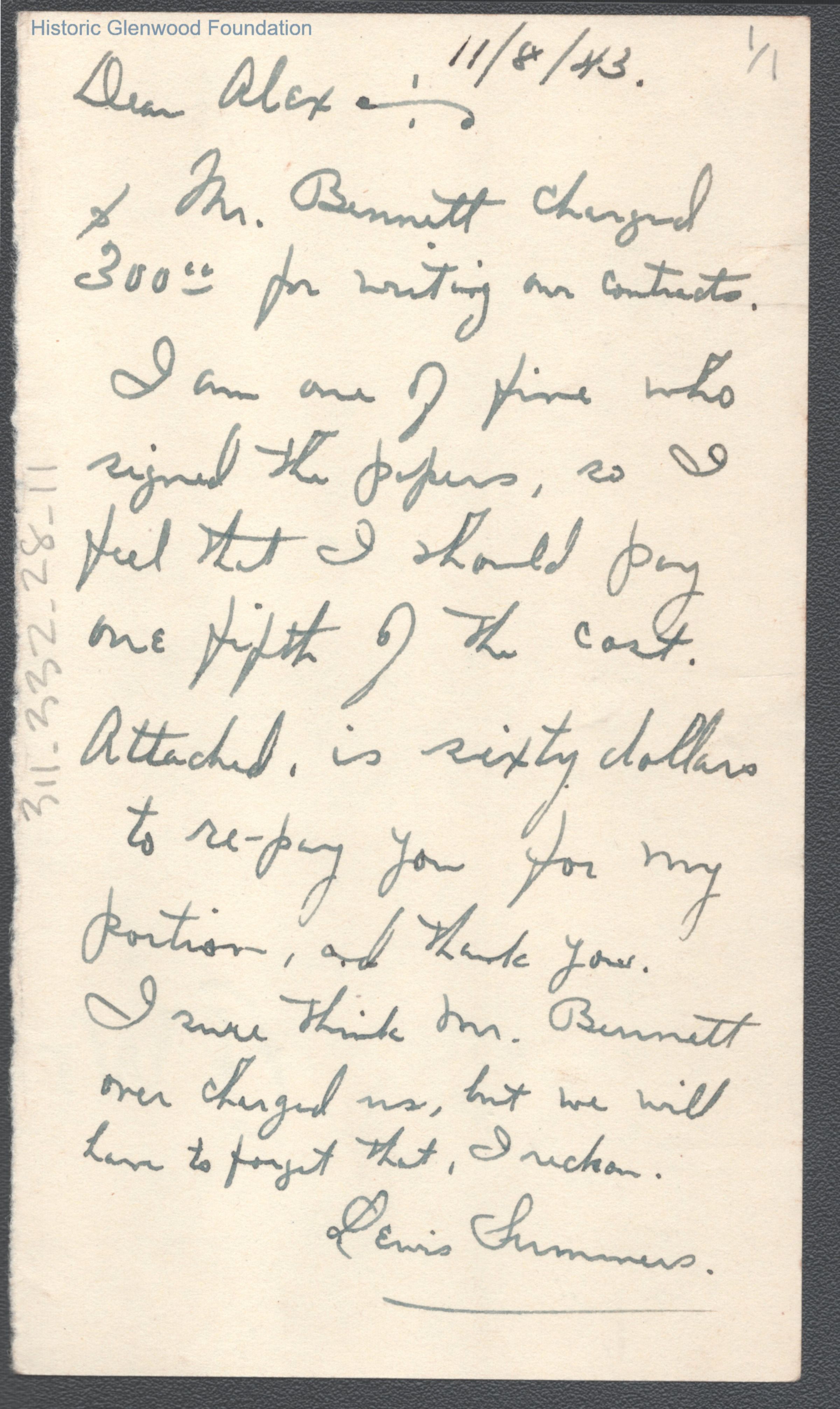 Single page letter from Lewis Summers, Jr. to nephew Alexander W. Quarrier, Nov 8, 1943.