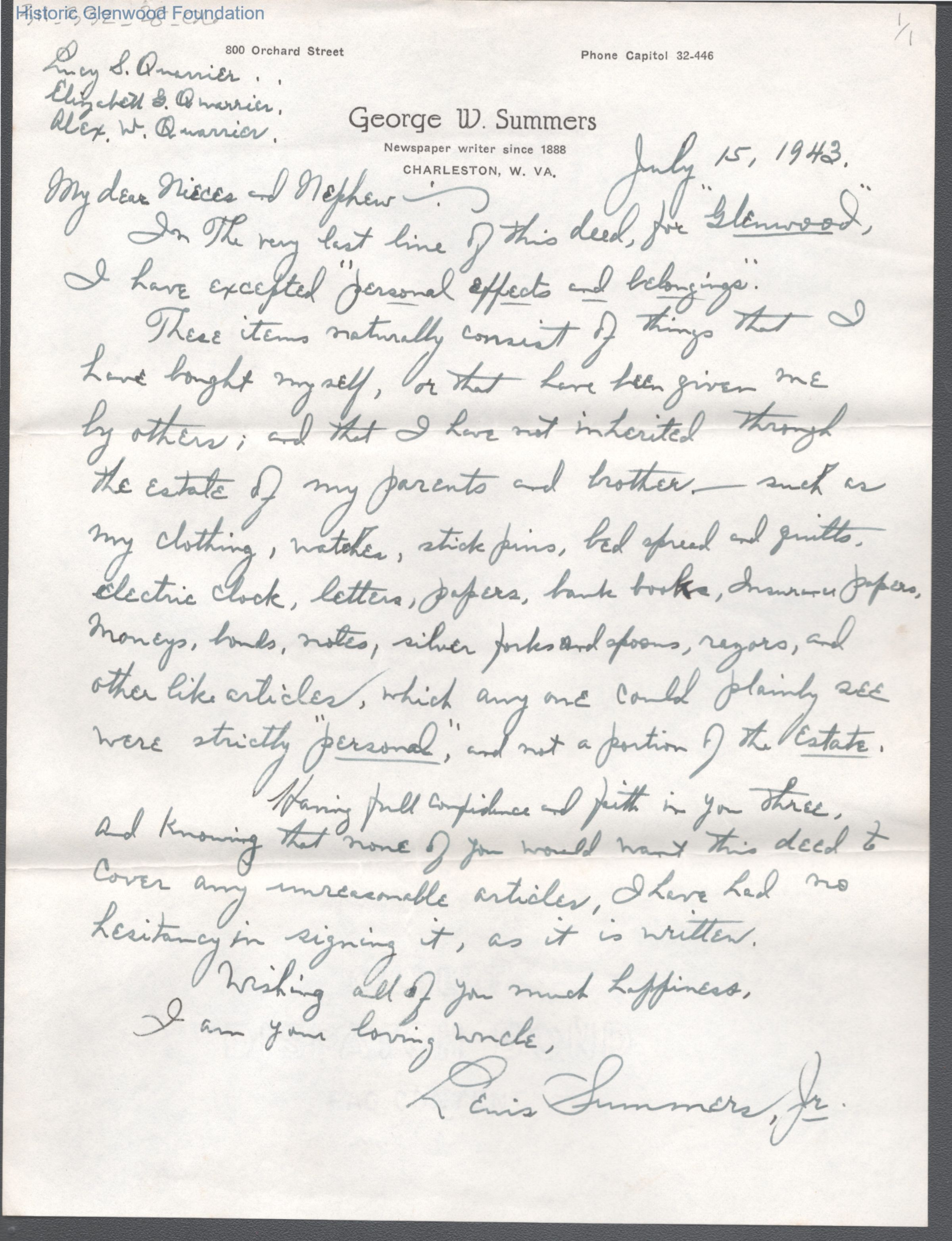 Single page letter from Lewis Summers, Jr. to "Nieces and Nephew", Jul 15, 1943. Addressees are Lucy S. Quarrier, Elizabeth G. Quarrier, and Alex. W. Quarrier. Letter outlines some personal property exceptions to deed to Glenwood.Creator