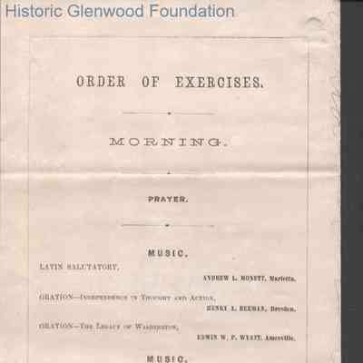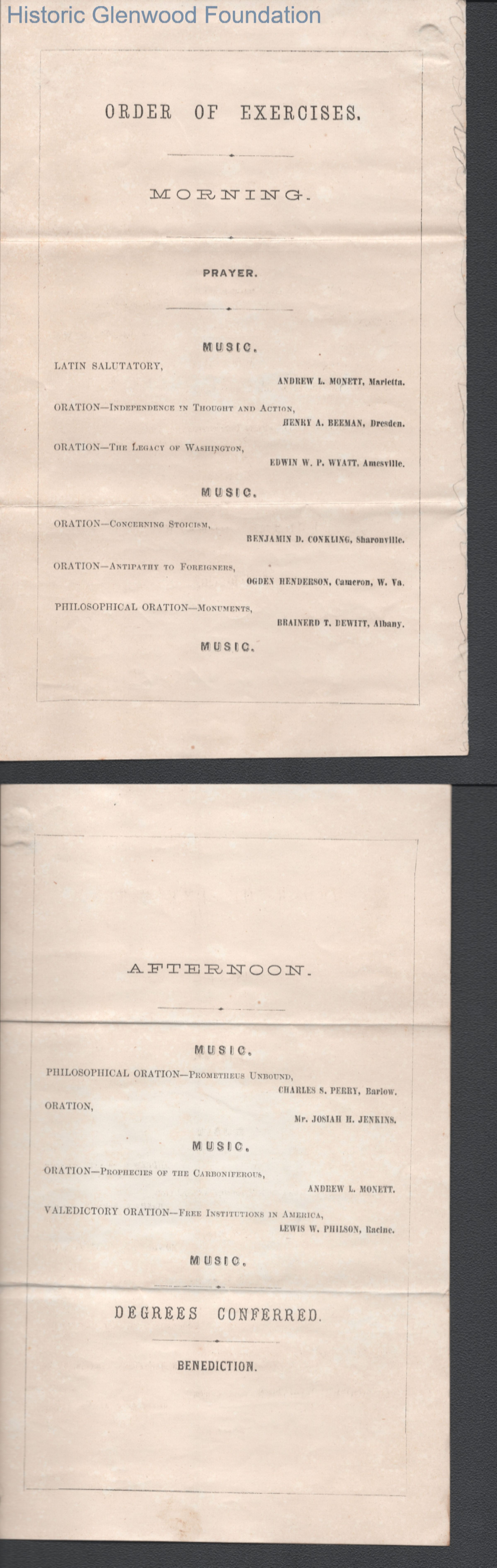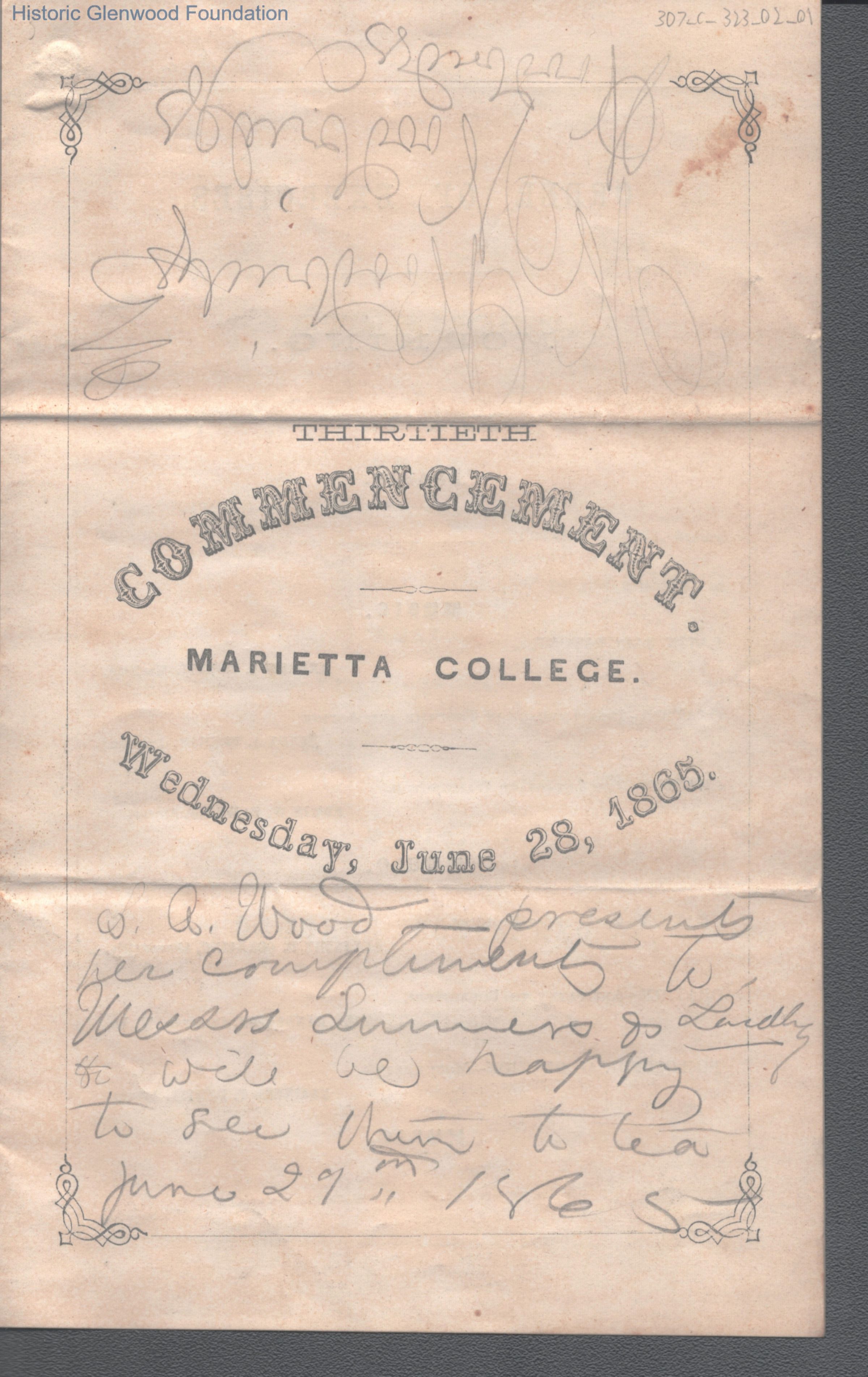 Commencement pamphlet from Marietta College, also includes a personal handwritten note inviting Messrs Summers and Laidley to tea on June 29, 1865