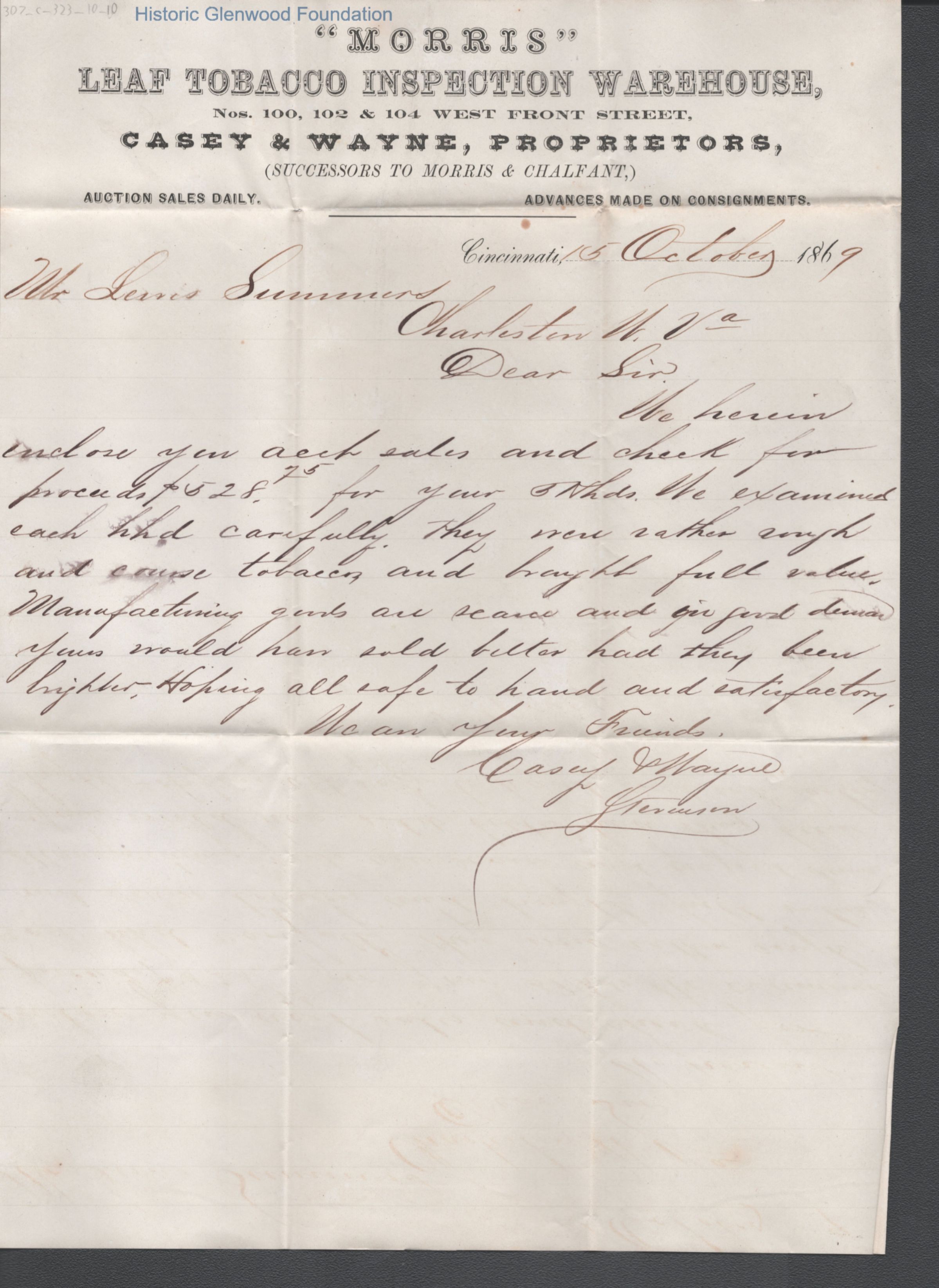 Lewis Summers, Morris Tobacco letter with enclosed check