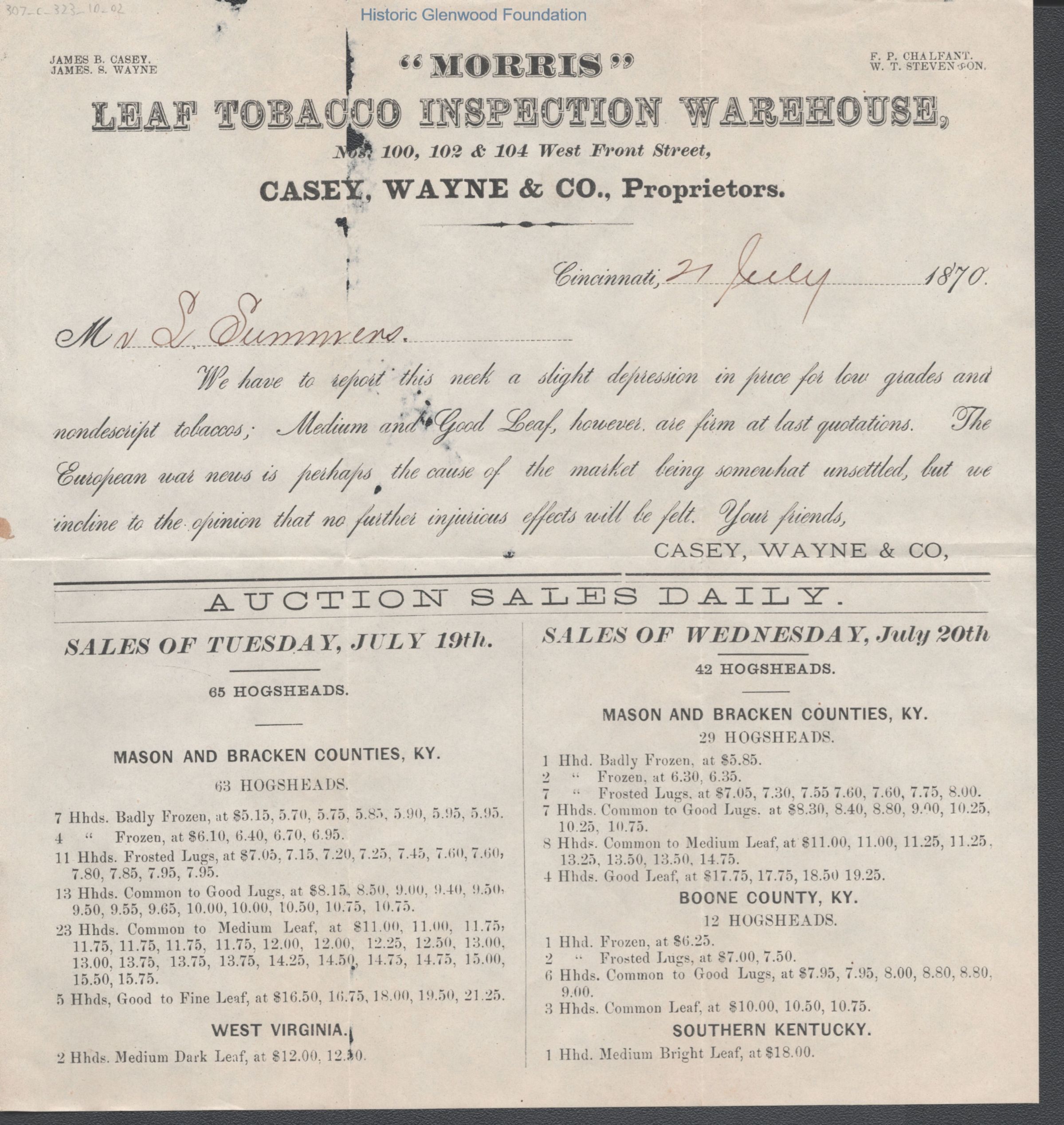 Lewis Summers, Morris Tobacco memo on market prices due to the "European war"Entry/Object ID