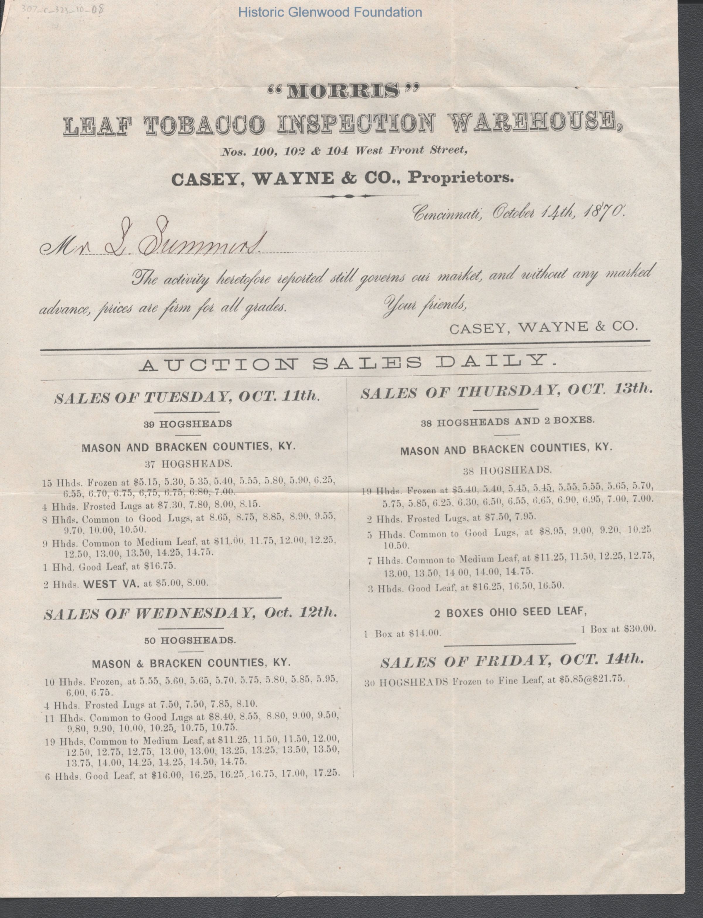 Lewis Summers, Morris Tobacco update memo