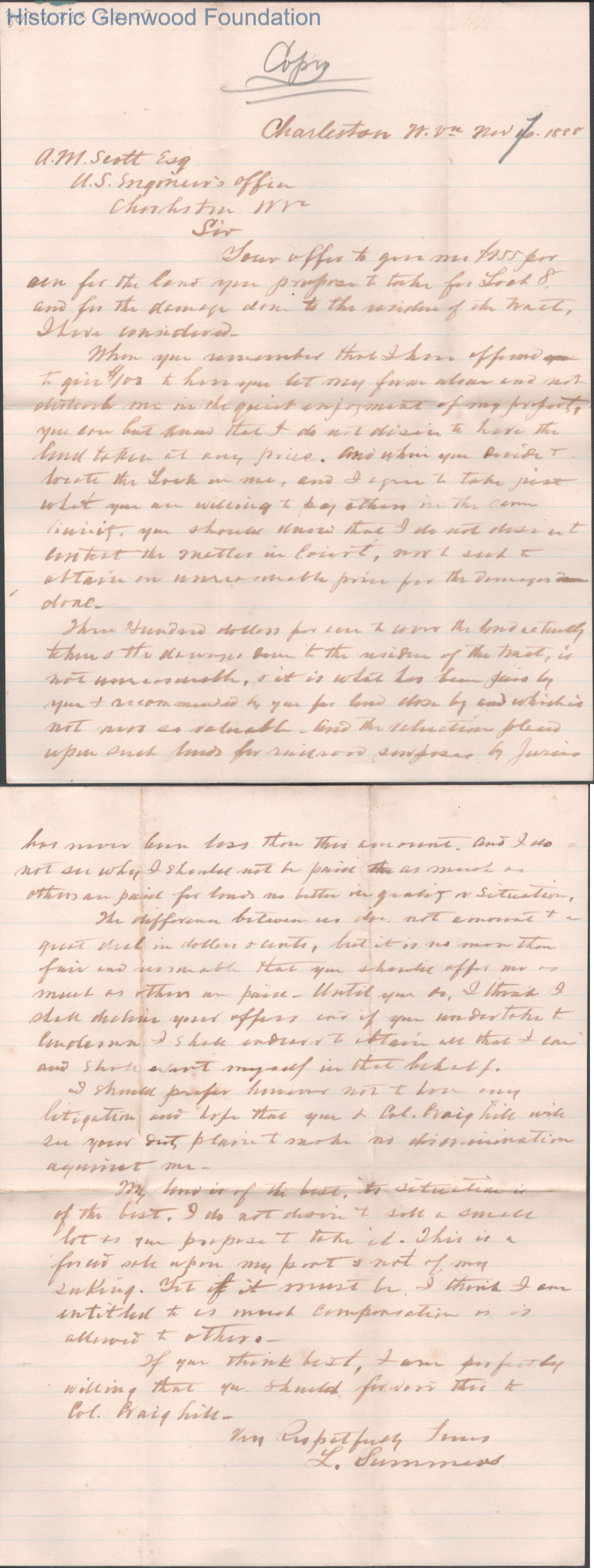 Two-page letter from Lewis Summers to A. M. Scott, Nov 16, 1888. Noted in pencil as "Copy" and subsequently dated Nov 17, 1888.