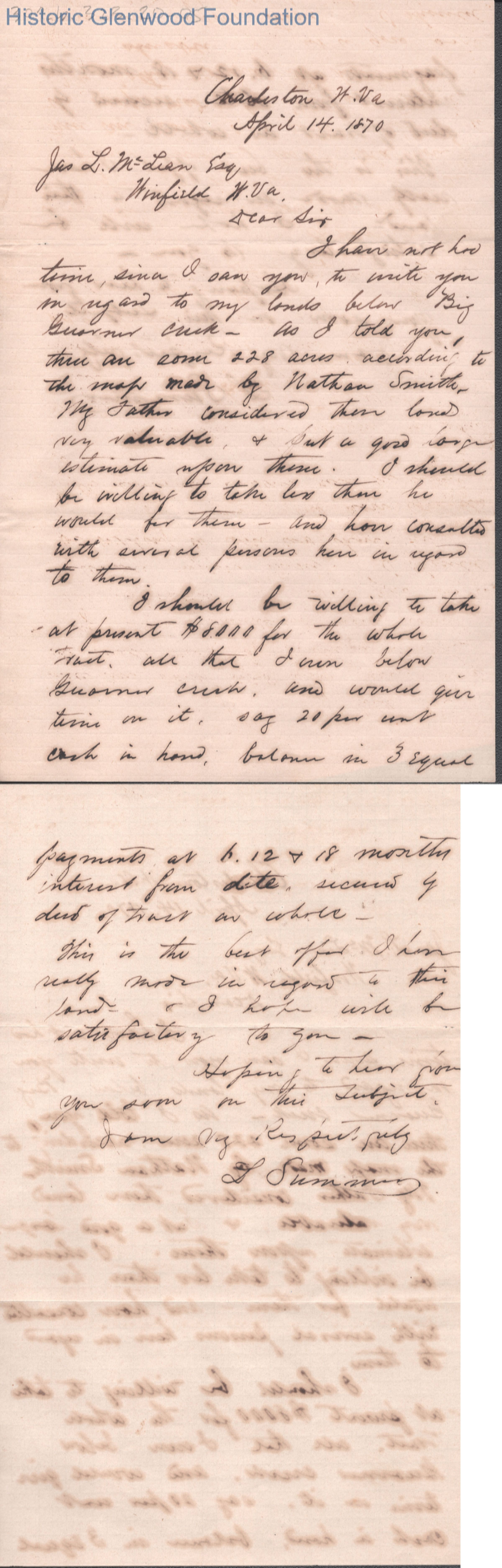 Two-page letter from Lewis Summers to James L. McLean, Apr 14, 1870.