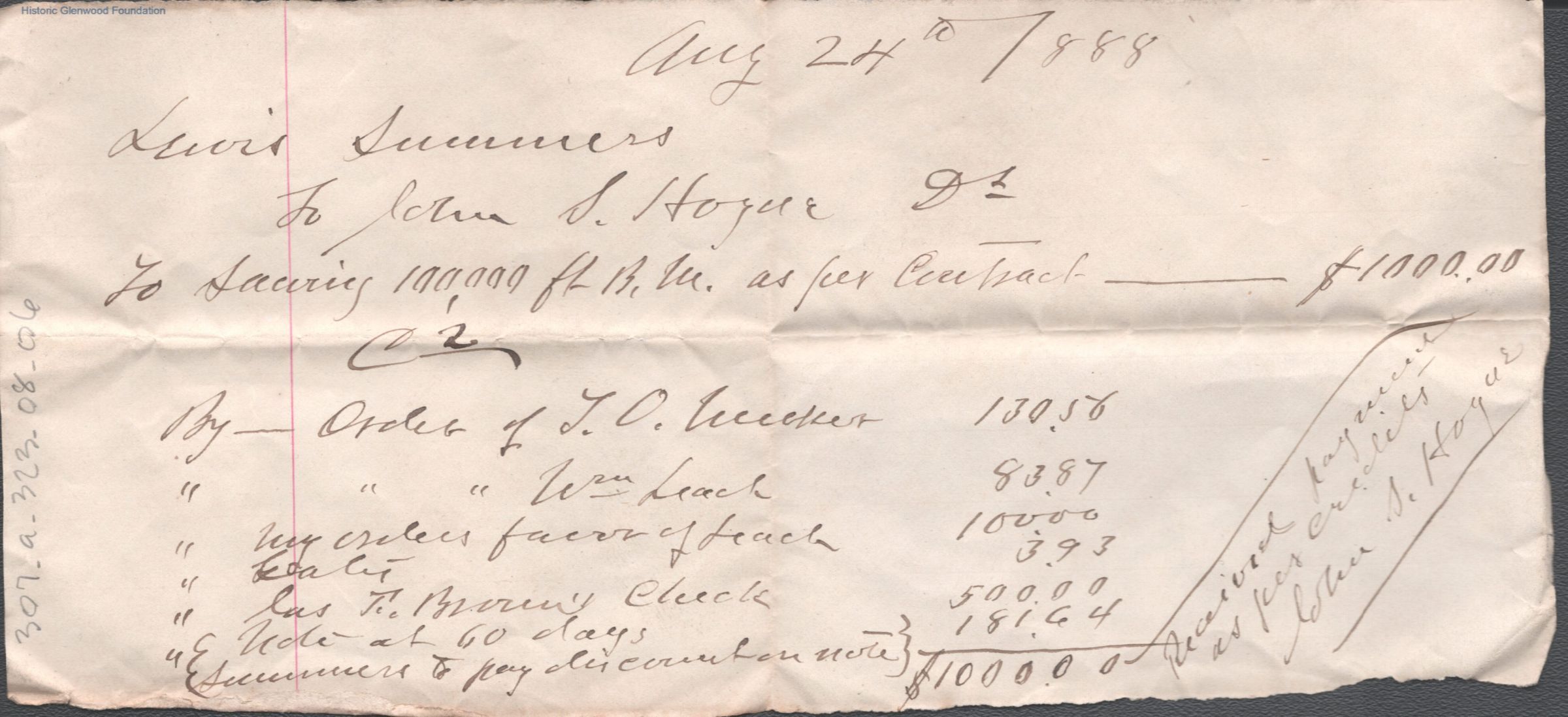 Itemized paid receipt from Lewis Summers to John S. Hogue, Aug 24, 1888.