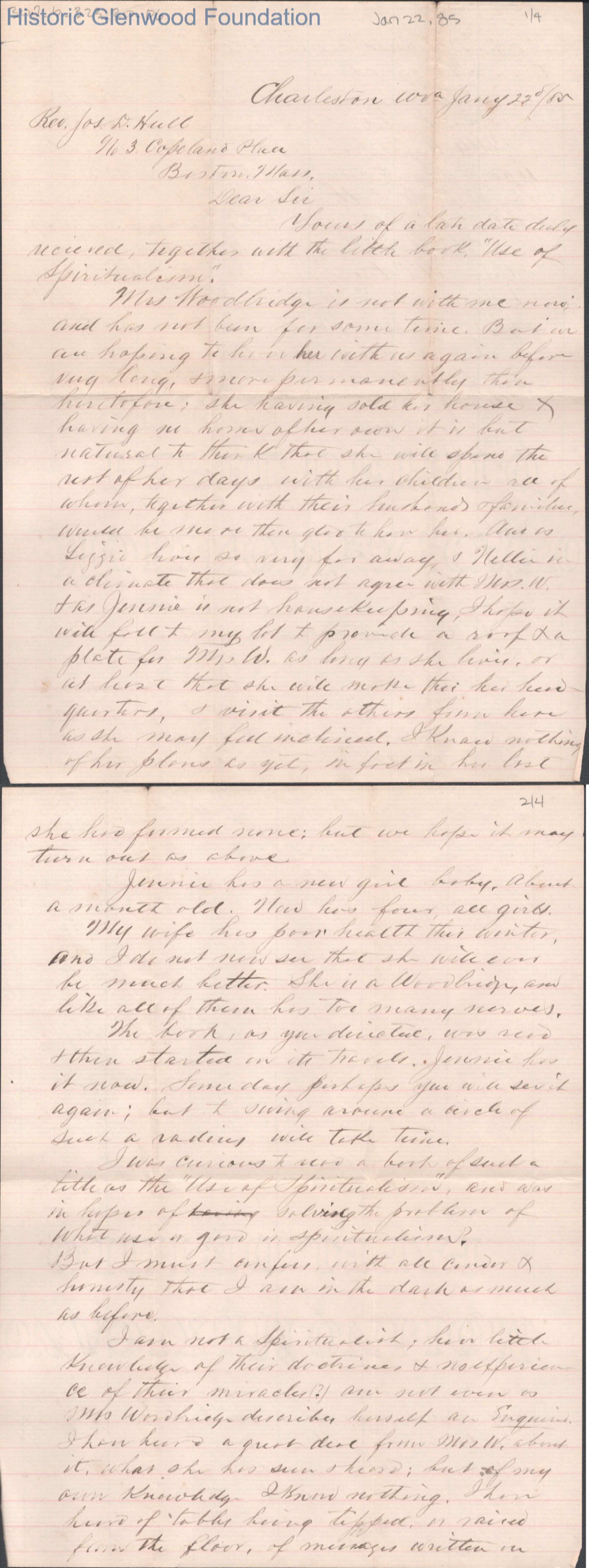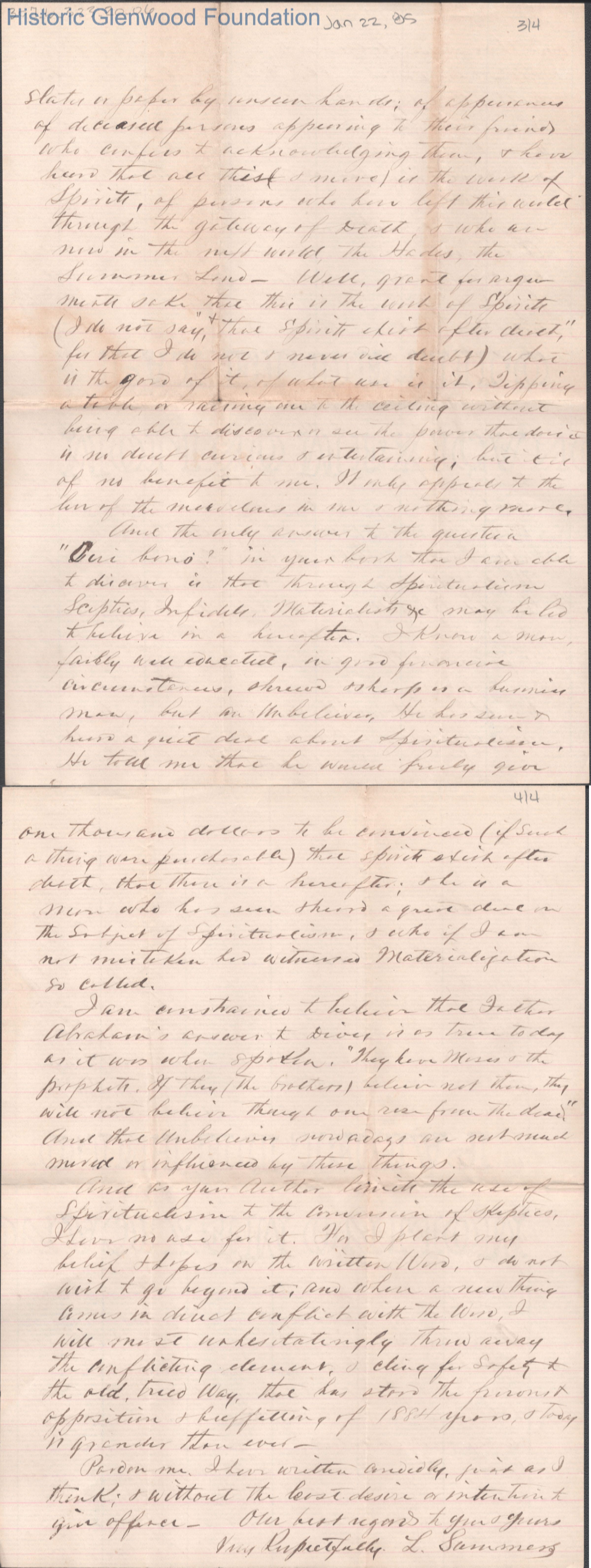 Four-page letter from Lewis Summers to Rev. Josiah D. Hull, Jan 22, 1885.