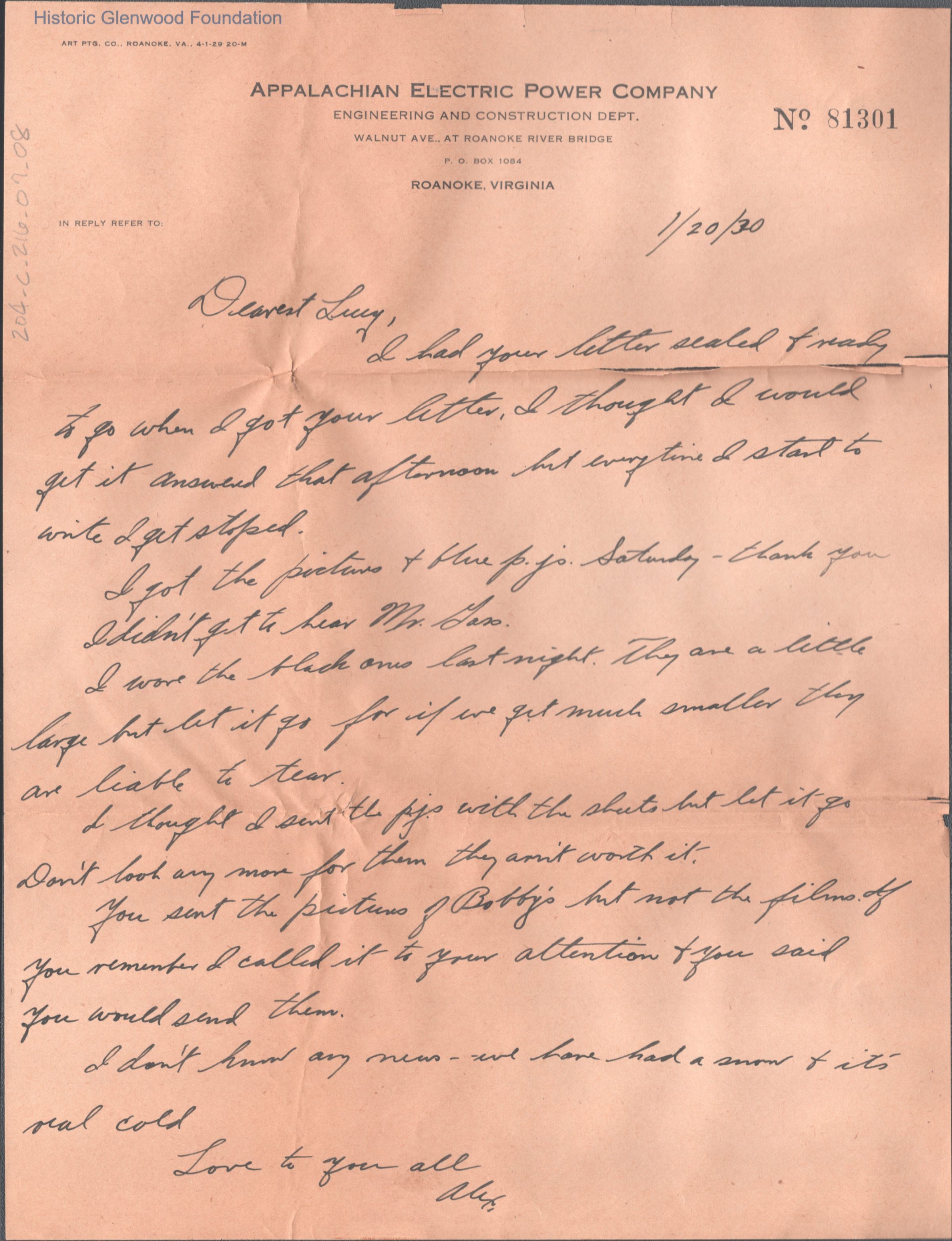 Lucy S. Quarrier from Alexander W. Quarrier, Jan 20, 1930