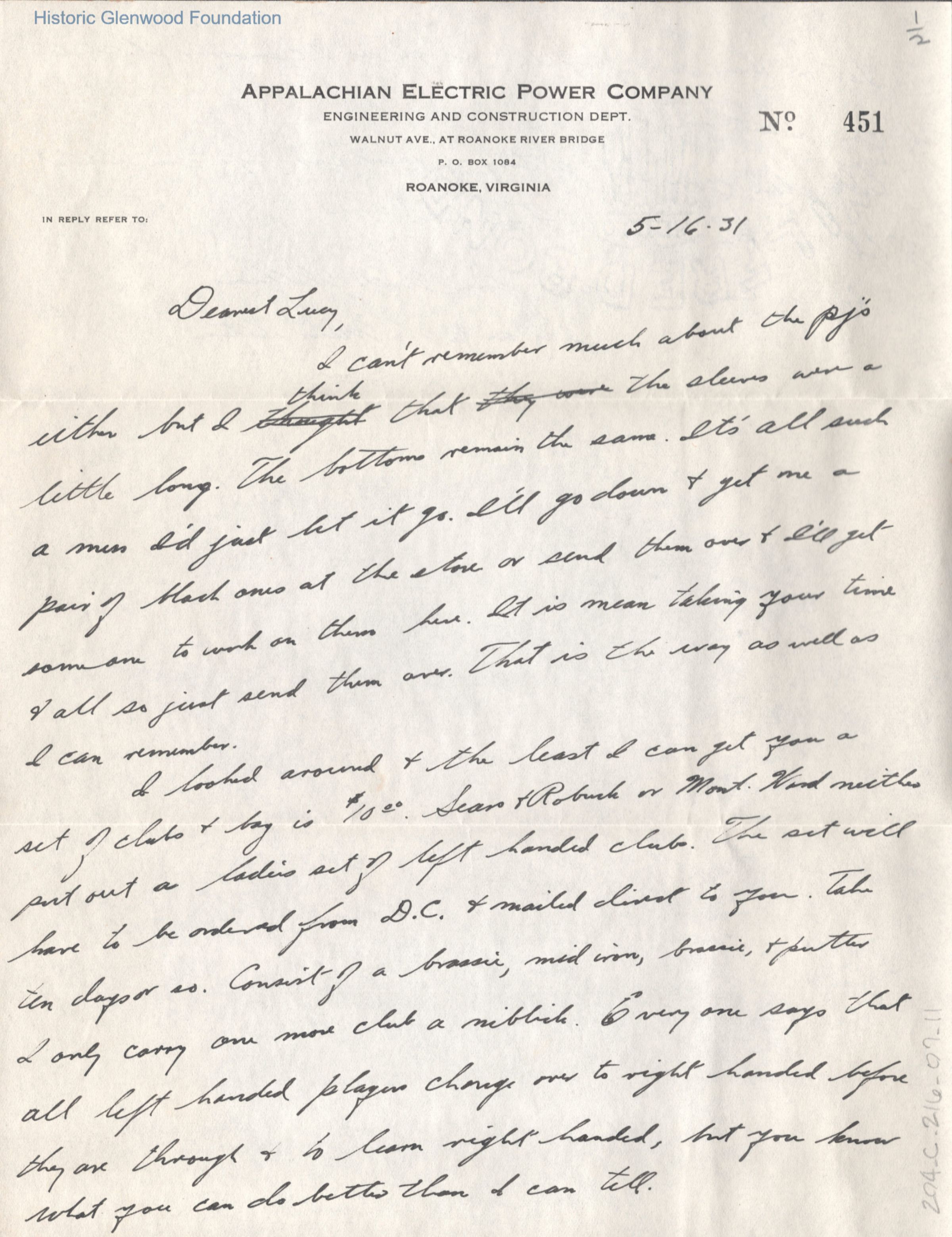 Lucy S. Quarrier from Alexander W. Quarrier, May 16, 1931