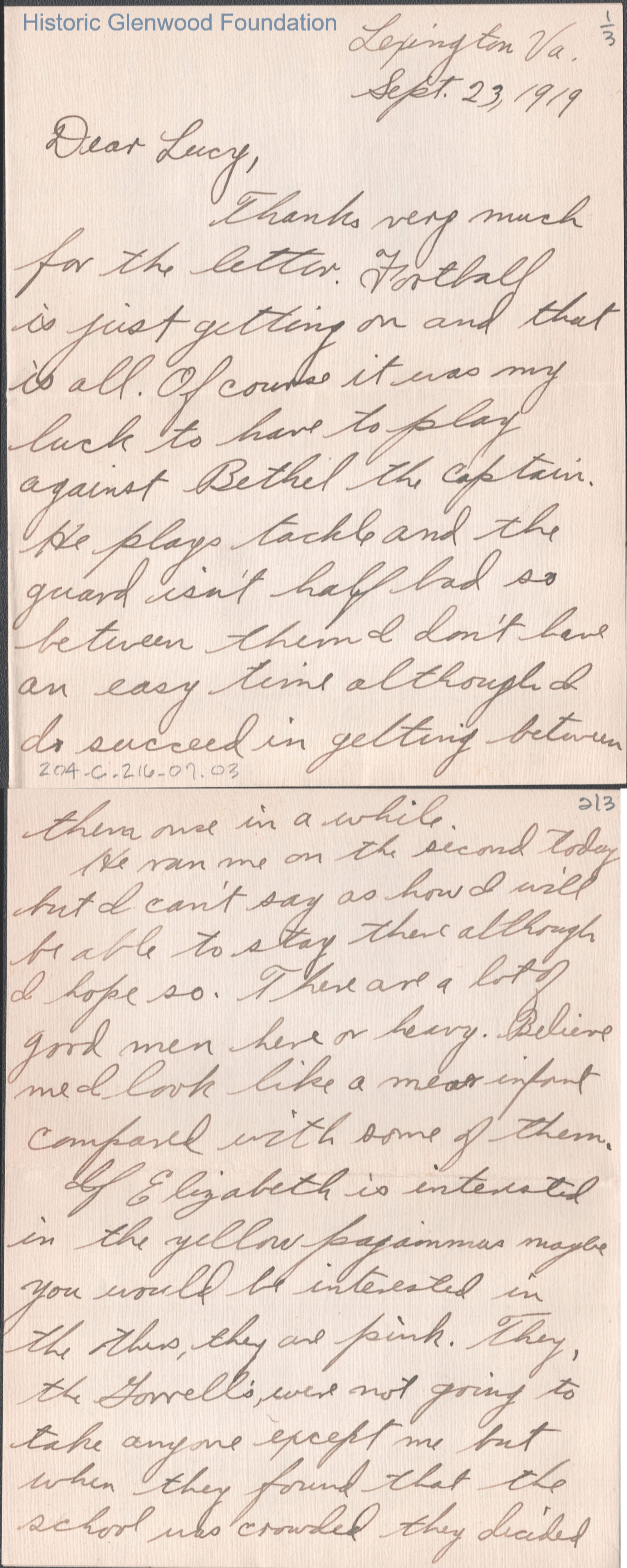 Three-page letter to Lucy S. Quarrier from Alexander W. Quarrier, Sep 23, 1919.