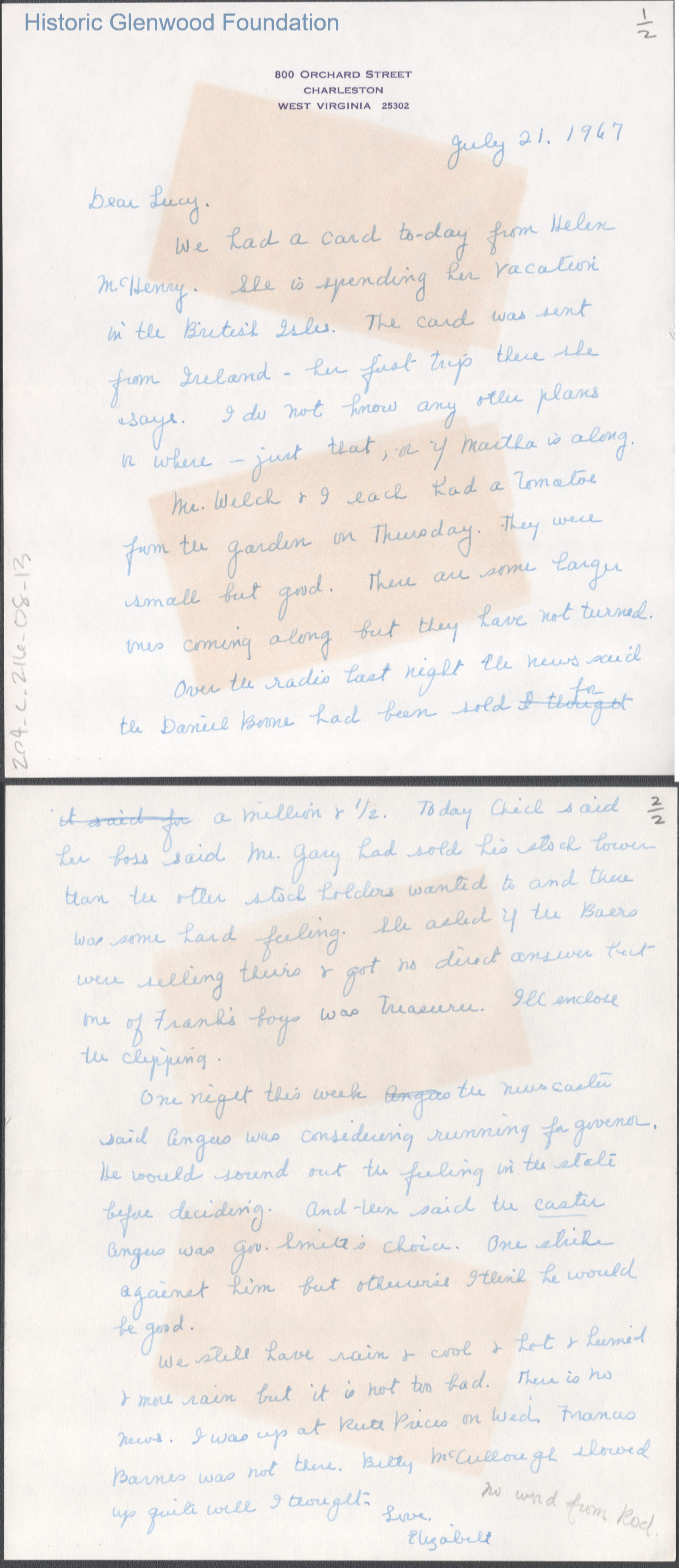 Two-page letter to Lucy S. Quarrier from Elizabeth G. Quarrier, Jul 21, 1967.
