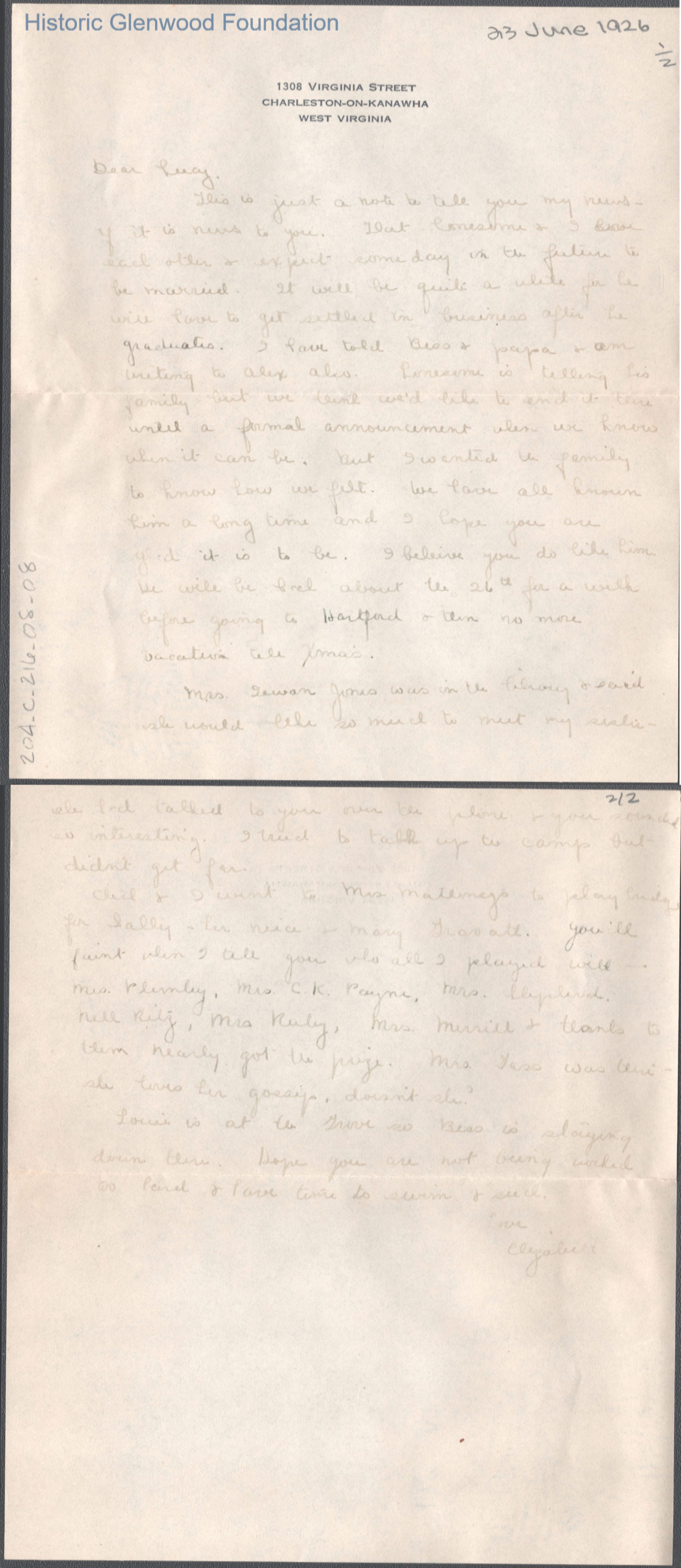 Two-page letter to Lucy S. Quarrier from Elizabeth G. Quarrier, Jun 23, 1926.