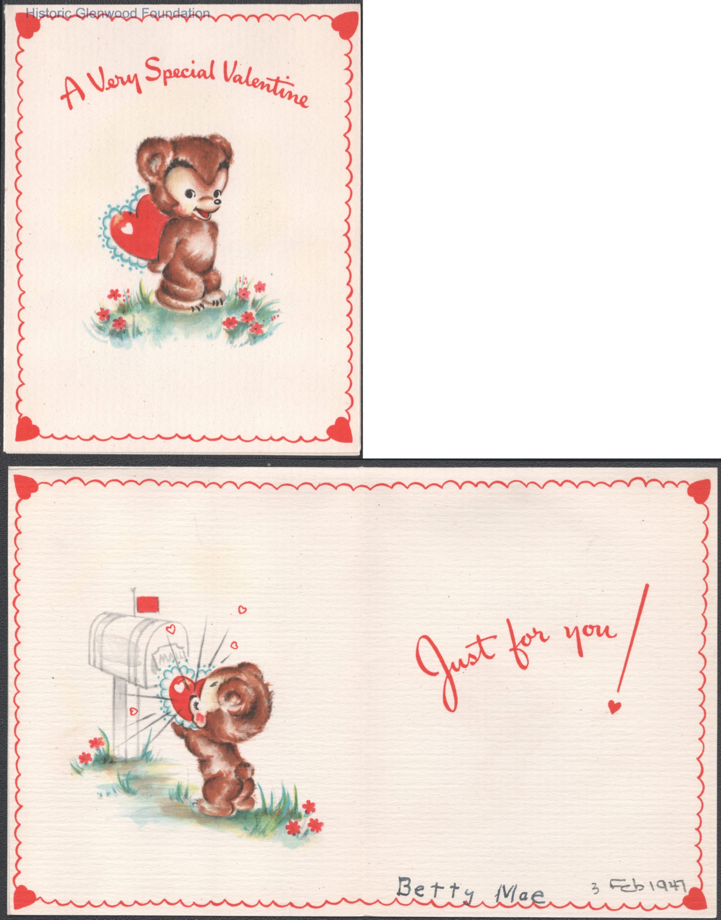 Valentine's Day card to Lucy S. Quarrier from Elizabeth Q. Hedrick, Feb 3, 1947. Signed "Betty Mae".