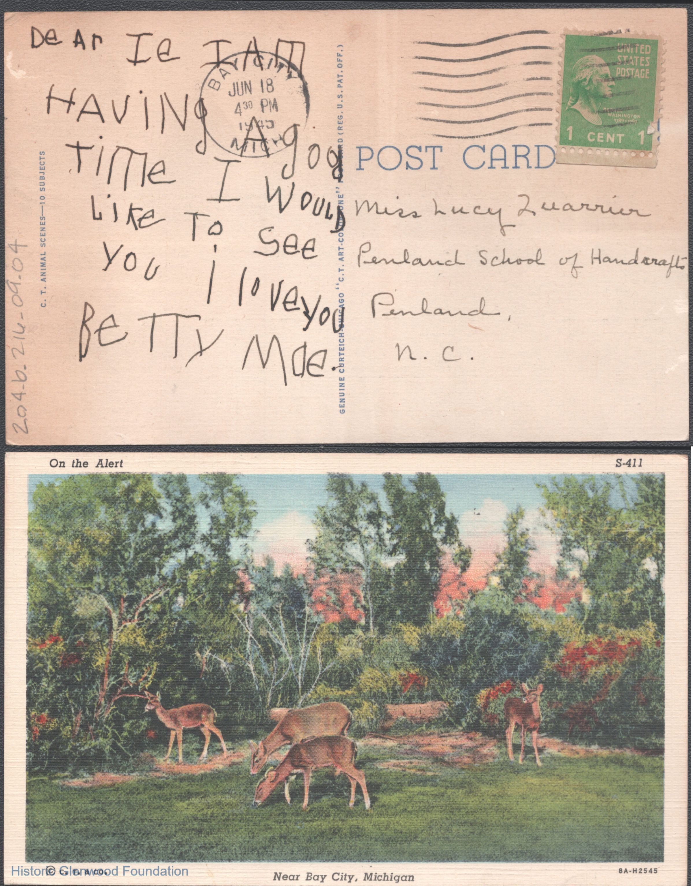 Postcard to Lucy S. Quarrier from Elizabeth Q. Hedrick, Jun 18, 1945. Signed "Betty Mae."