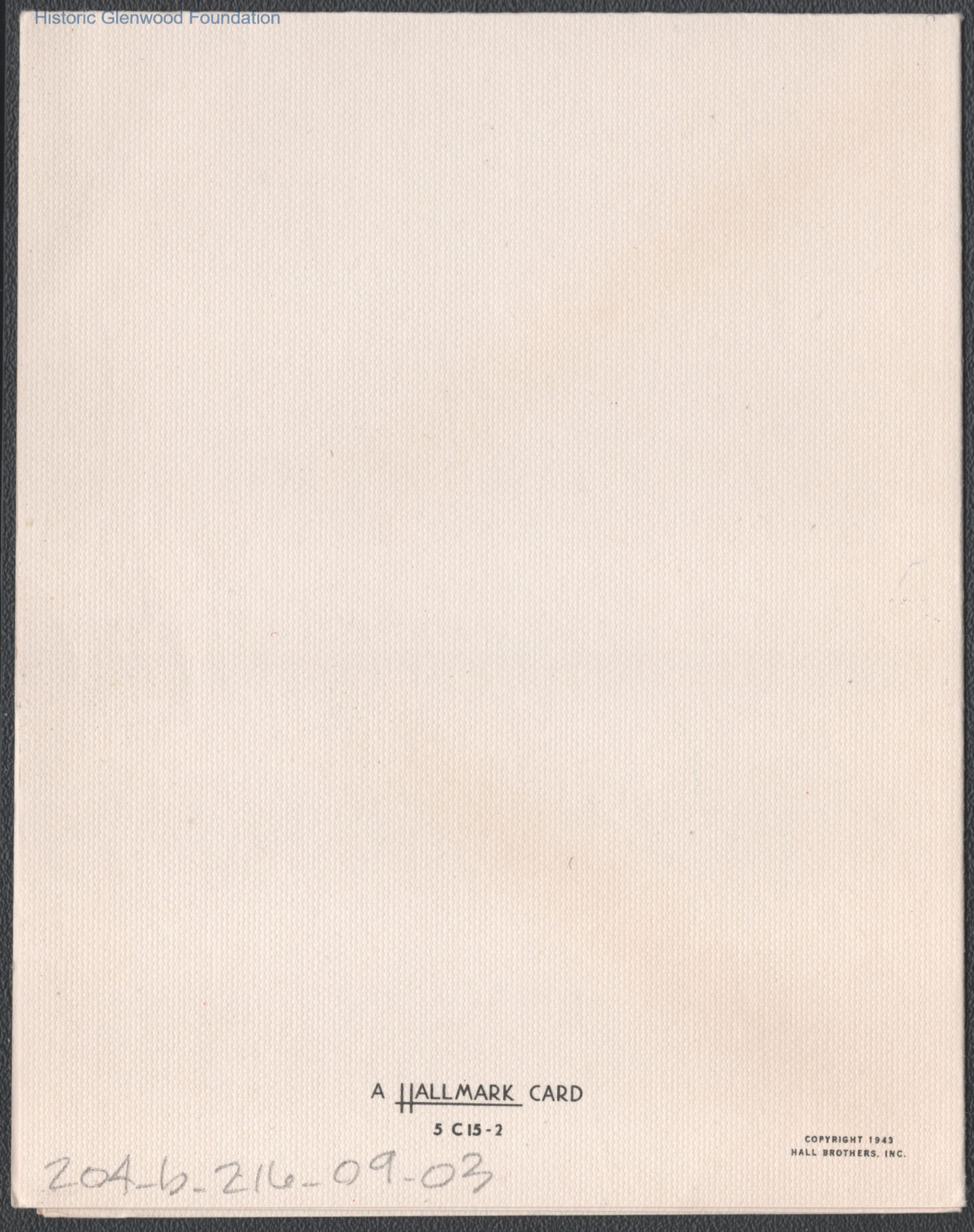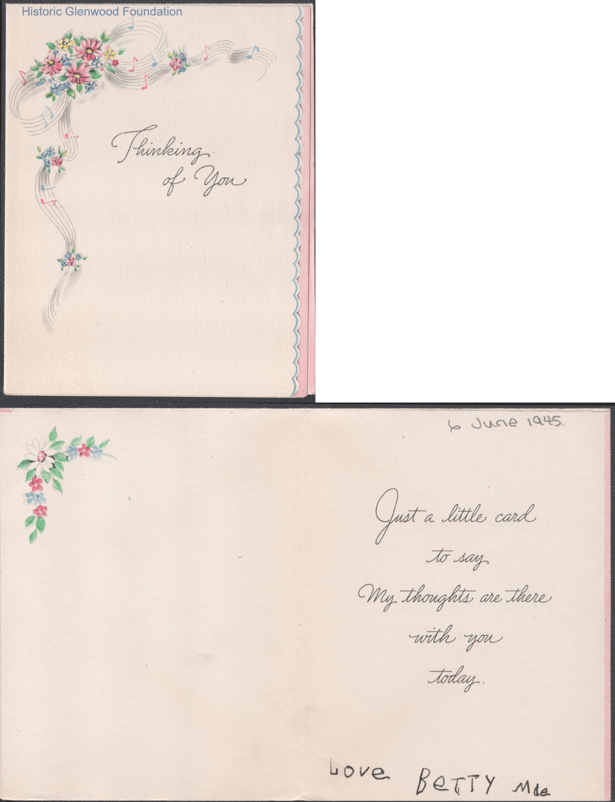 Greeting card to Lucy S. Quarrier from Elizabeth Q. Hedrick, Jun 18, 1945. Signed "Betty Mae".