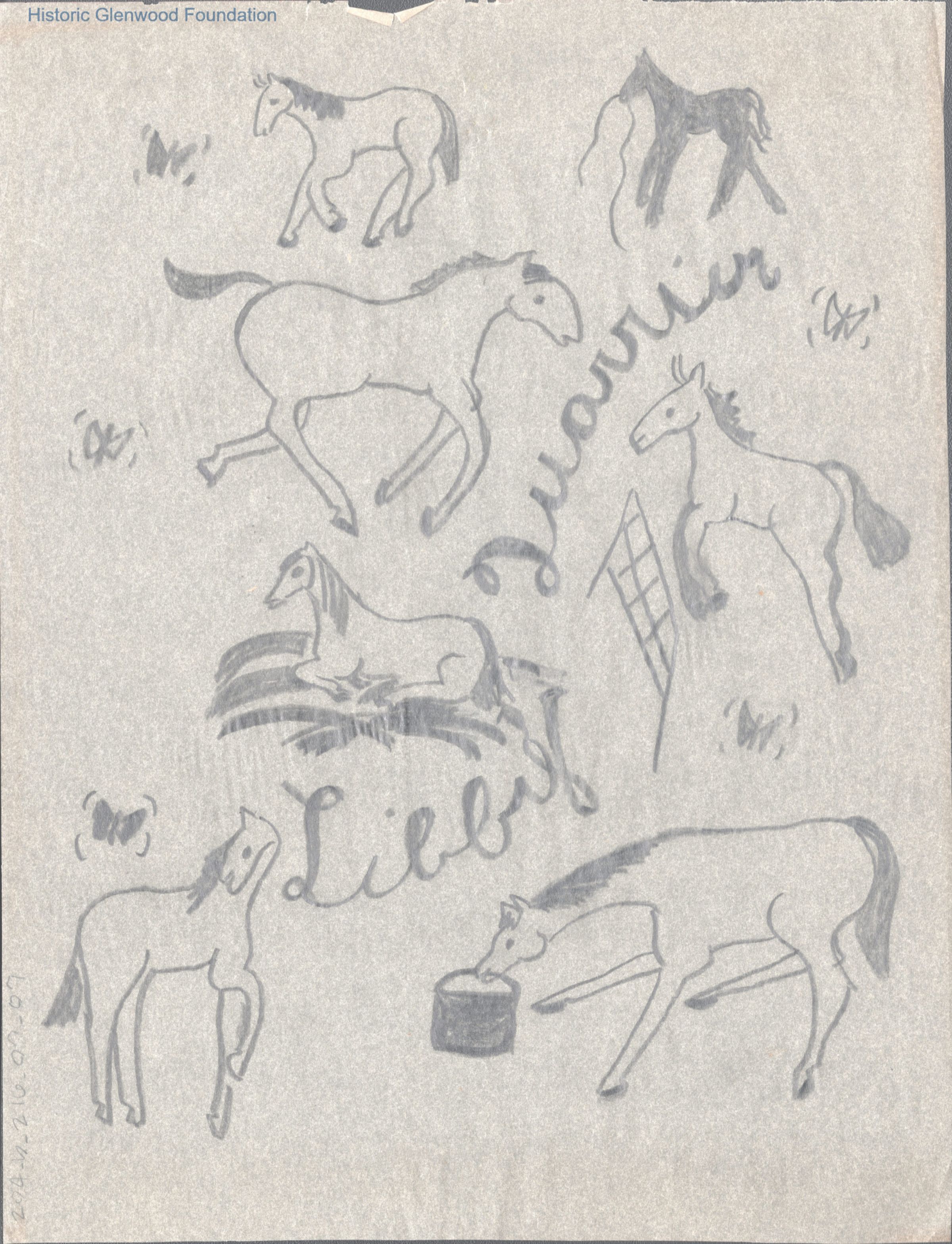 Single page of equestrian sketches to Lucy S. Quarrier from Elizabeth Q. Hedrick, unknown date.