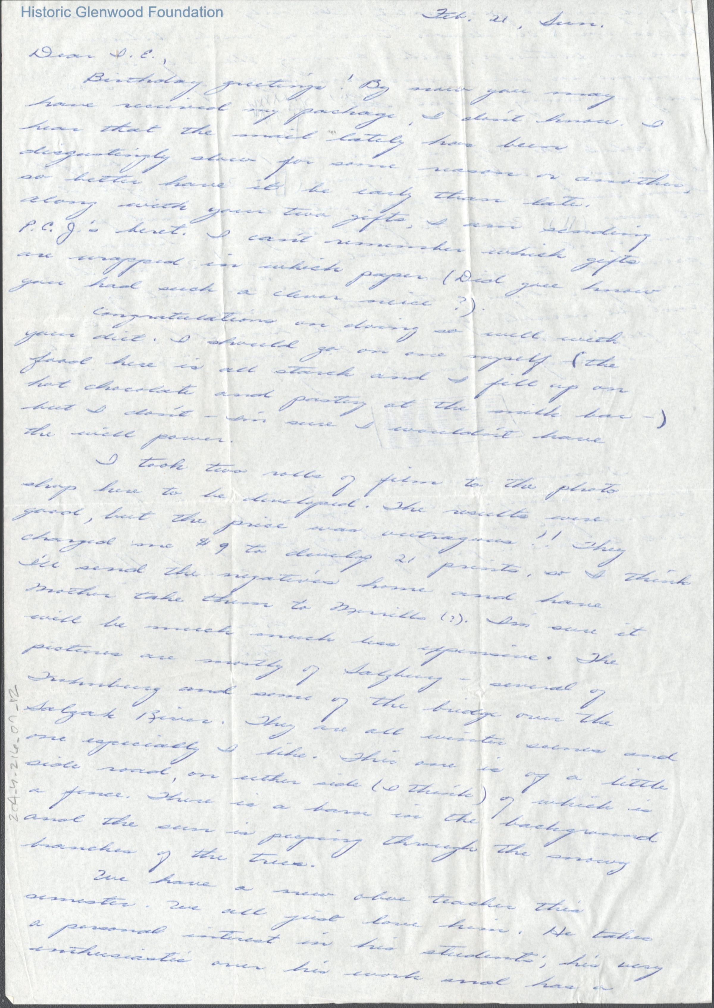 Two-page letter to Lucy S. Quarrier from Elizabeth Q. Hedrick, unknown year ("Feb. 21, Sun." is noted).