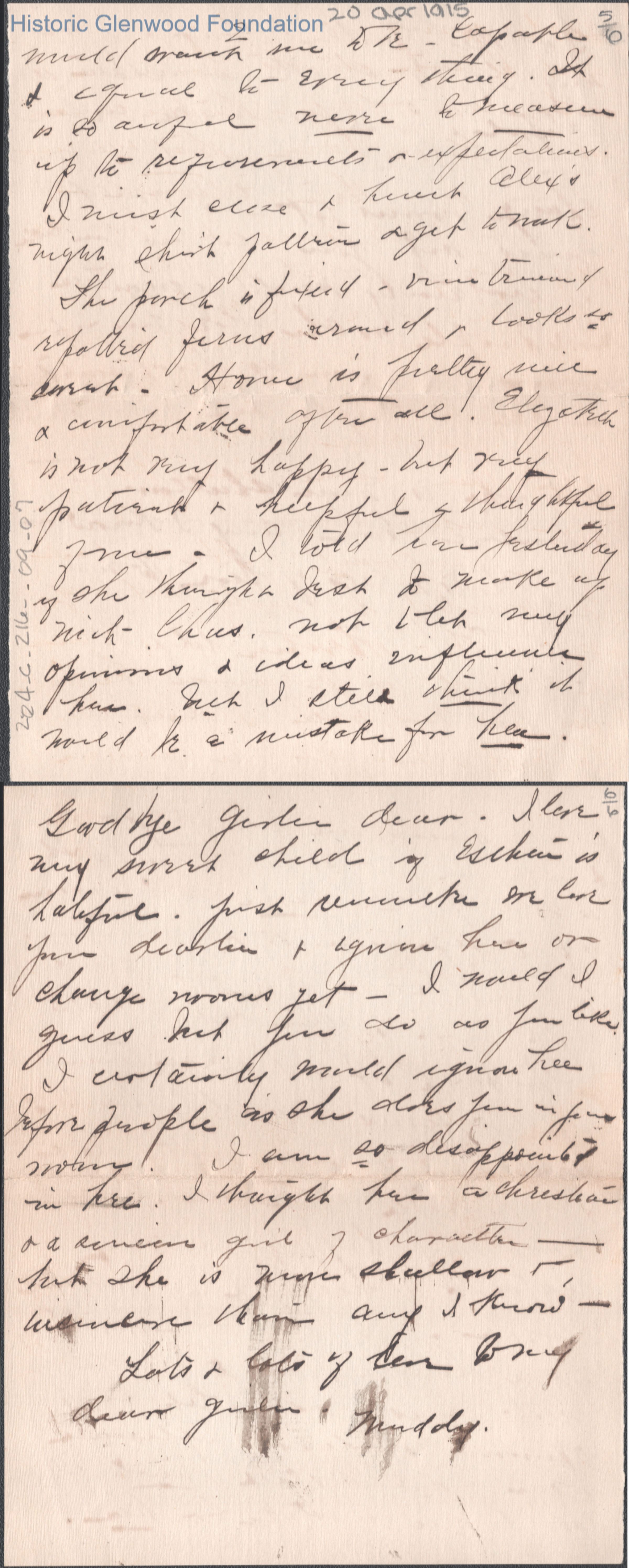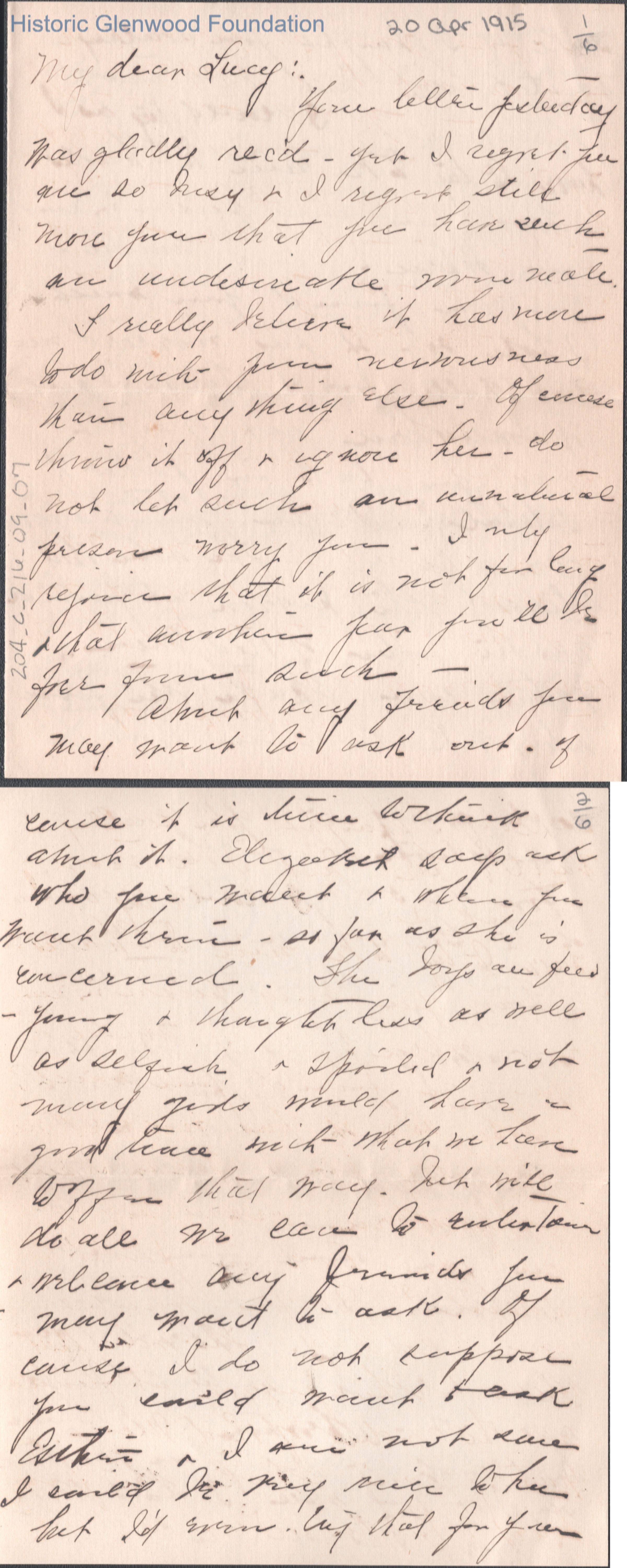 Six-page letter to Lucy S. Quarrier from Elizabeth S. Quarrier, Apr 20, 1915.